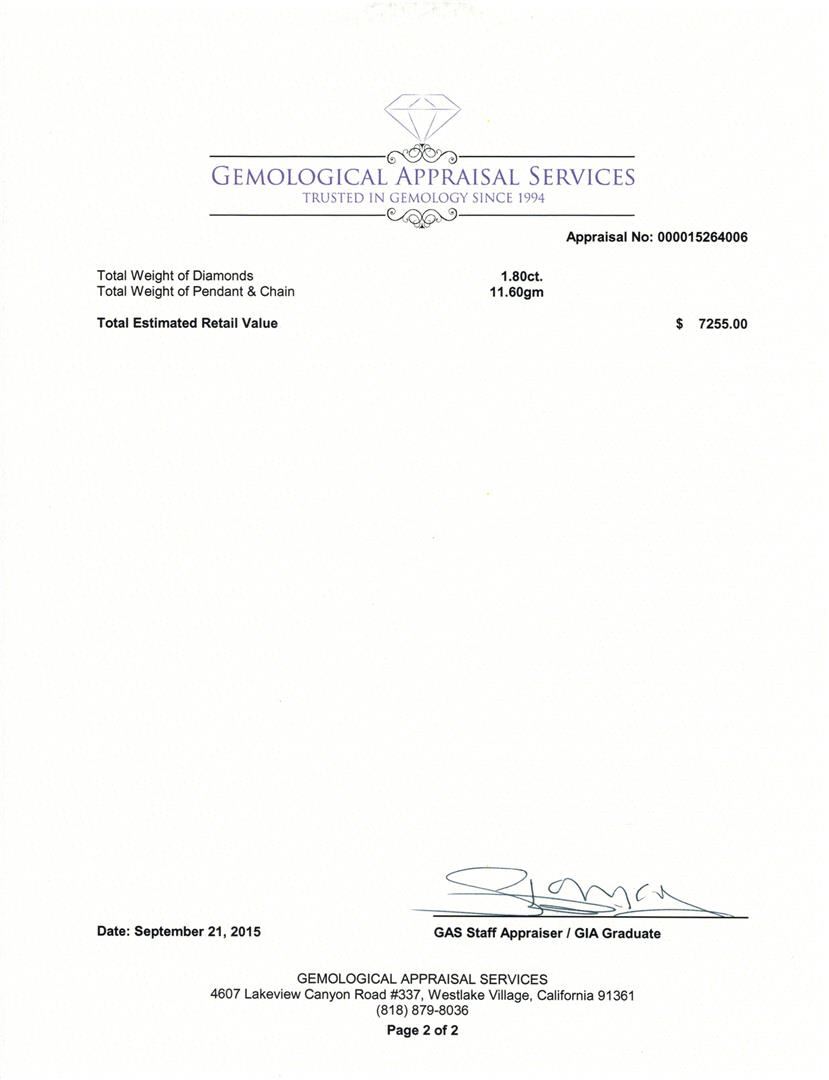 One electronically tested 14KT white gold lady's combination cast & assembled fashion pendant & chain 18.0" long, 1.7mm diamond cut loose rope chain with a spring ring clasp with a bright polish finish. Identified with markings of "14K". Condition is new, good workmanship. Containing: One round brilliant cut diamond, measuring 5.01 - 5.00 x 2.86mm (depth est.) approximate weight of 0.45ct. Colored gemstones are presumed to have been subjected to commonly used enhancement processes. Graded in the setting. Clarity: SI-2 One prong set round brilliant cut diamond, measuring 4.45 - 4.42 x 2.57mm (depth est.) approximate weight of 0.30ct. Graded in the setting. Clarity: SI-1. Color: L - M. Cut Good One prong set round brilliant cut diamond, measuring 3.35 - 3.32 x 2.23mm (depth est.) approximate weight of 0.15ct. Graded in the setting. Clarity: SI-2. Color: J - K. Cut Good One Hundred Sixty-Five prong set round brilliant cut diamonds, measuring 1.20 - 1.10 x 0.69mm (depth est.) approximate total weight of 165 Stones = 0.90ct. Graded in the setting. Clarity: I-1 to I-2. Color: H - Good. Total Weight of Diamonds 1.80ct. Total Weight of Pendant & Chain 11.60gm at $7255.00.. GAS Appraised at $7,255.00.