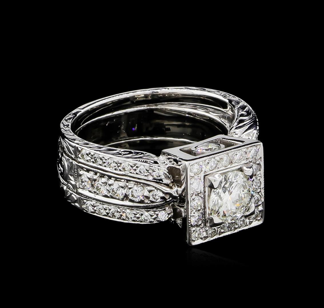 One electronically tested 18KT white gold ladies cast diamond ring. The featured diamond is set within a diamond bezel supported by a diamond set box gallery and engraved diamond set shoulders, completed by a seven millimeter wide band. Bright polish finish with engraving and milgrain detailing. Identified with markings of "18K". Condition is good. Containing: One prong set round brilliant cut diamond, measuring 5.90 - 5.90 x 3.80mm (depth est.) approximate weight of 0.81ct. Graded in the setting. Clarity: I-1. Color: 64.4%. Table 64.4%. Two bezel set round brilliant cut diamonds, measuring 3.20 - 3.10 x 1.89mm (depth est.) approximate total weight of 2 Stones = 0.25ct. Graded in the setting. Clarity: VS-2. Color: G Eight prong set round brilliant cut diamonds, measuring 1.90 - 1.90 x 1.14mm (depth est.) approximate total weight of 8 Stones = 0.21ct. Graded in the setting. Clarity: VS-1 to SI-1. Color: G - I Thirty-Four prong set round brilliant cut diamonds, measuring 1.60 - 1.40 x 0.90mm (depth est.) approximate total weight of 34 Stones = 0.46ct. Graded in the setting. Clarity: VS-2 to SI-2. Color: G - I Eight prong set round brilliant cut diamonds, measuring 1.20 - 1.20 x 0.72mm (depth est.) approximate total weight of 8 Stones = 0.07ct. Graded in the setting. Clarity: SI-1 to SI-2. Color: G - I. Total Weight of Diamonds 1.80ct. Total Weight of Ring 13.93gm. AIG Appraised at $10,740.00.