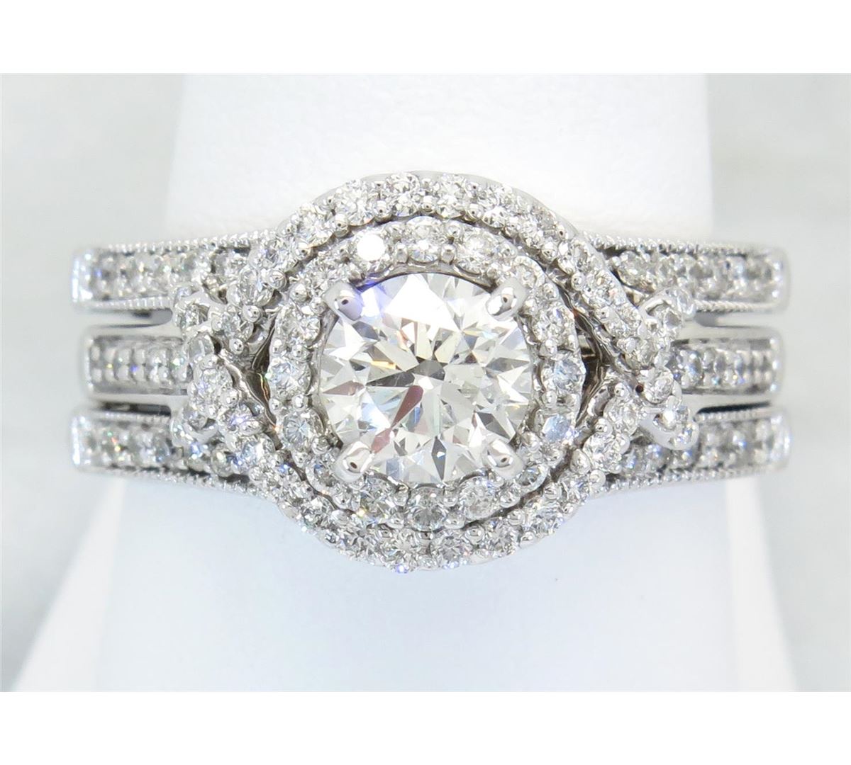 One tested 14K white gold diamond ring. Containing: One Round Brilliant Cut Diamond. Approximate size: .85CT, Clarity: I, Color: F-G. 96 Round Brilliant Cut Diamonds. Approximate total diamond weight: 1.81CTW. All diamonds are graded in the mounting unless otherwise stated. Weight of ring: 10.8 grams, Size: 8.25.