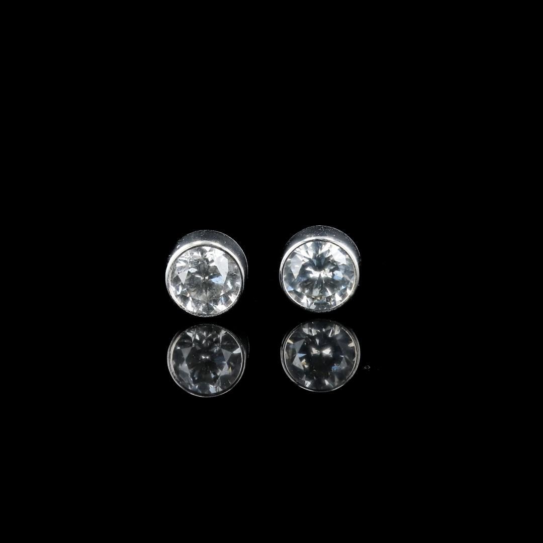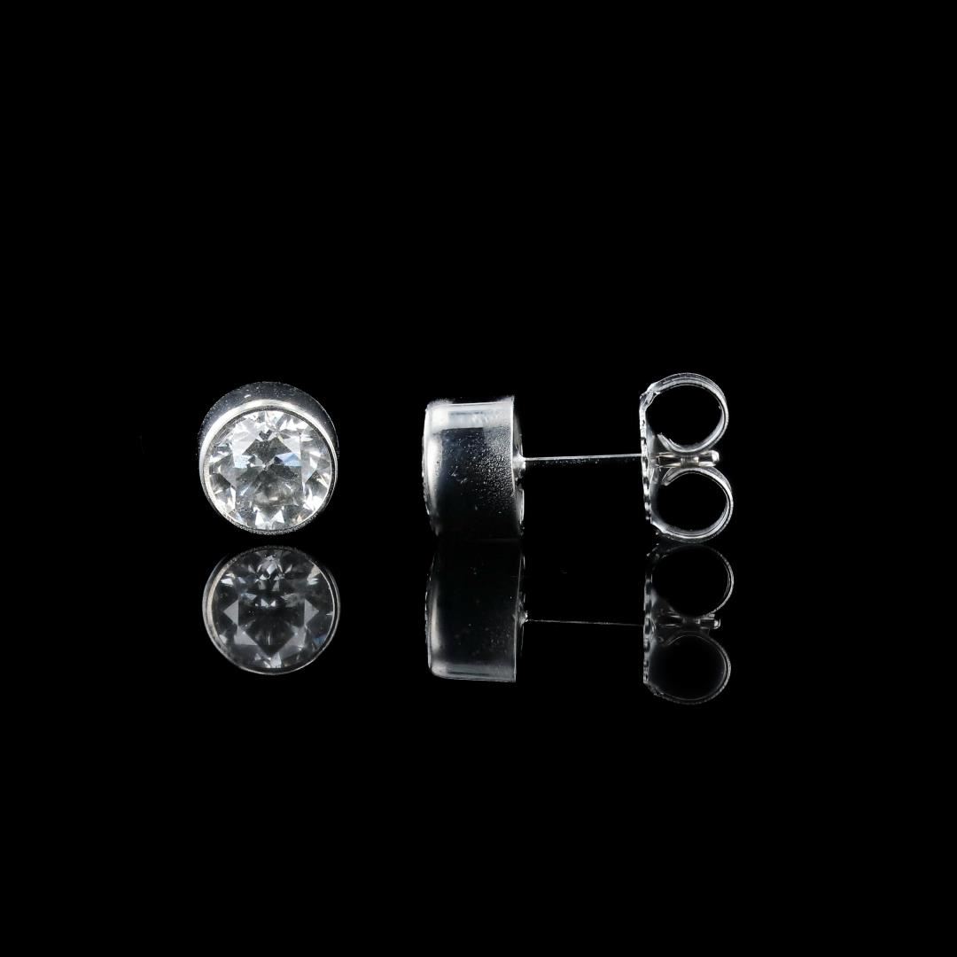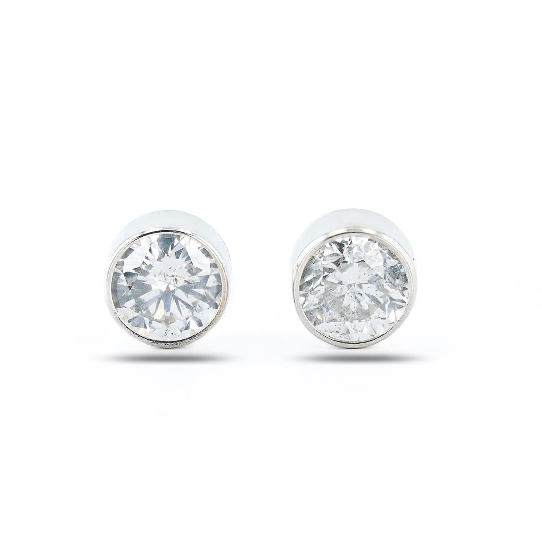 One polished, stamped, and tested pair of 14K white gold stud earrings with friction posts and backings. The earrings are mounted with 2 genuine round diamonds weighing approximately 1.81 carats. This item weighs 2.0 grams, condition is new, excellent workmanship. #MAIN GEMSTONES# Identity: Natural Diamond; Shape: Round; Cutting Style: Brilliant Cut; Quantity: 2 Diamonds; Average Diameter: 5.8 mm, 5.9 mm; Total Weight: 1.81 carats; Color Grade: G; Clarity Grade: SI2; Polish: Excellent; Symmetry: Very Good; Refractive Index: 2.417; Specific Gravity: 3.52 +/-0.01; Hardness: 10; TOTAL DIAMOND WEIGHT: 1.81 cts; WEIGHT OF ITEM: 2.0 grams; GOLD CONTENT: 14K White Gold