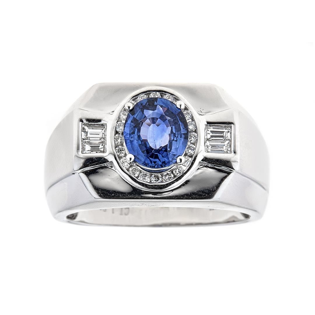 One Sapphire and Diamond Ring. Setting: 14 Kt. White Gold Mounting. Additional: 20 Round Diamonds and 4 Baguette Cut Diamonds = 0.40 Cts. TWT (G-H/VS-SI). Center Gem Stone Information: Species: Natural Corundum. Variety: Sapphire. Shape and Cut: Oval Mixed Cut. Measurements: 8.28 x 7.18 x 3.80 mm. Weight: 1.81 Carats. Transparency: Transparent. Color Hue: Blue. Saturation: Moderately Strong. Total Weight: 11.46 grams.