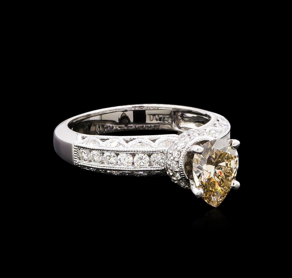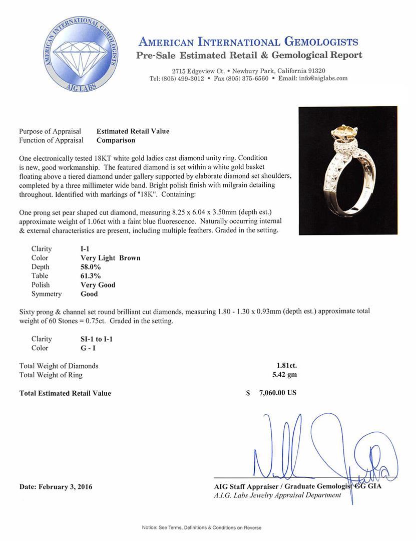 One electronically tested 18KT white gold ladies cast diamond unity ring. The featured diamond is set within a white gold basket floating above a tiered diamond under gallery supported by elaborate diamond set shoulders, completed by a three millimeter wide band. Bright polish finish with milgrain detailing throughout. Identified with markings of "18K". Condition is new, good workmanship. Containing: One prong set pear shaped cut diamond, measuring 8.25 x 6.04 x 3.50mm (depth est.) approximate weight of 1.06ct with a faint blue fluorescence. Naturally occurring internal & external characteristics are present, including multiple feathers. Graded in the setting. Clarity: I-1. Depth: 58.0%. Table 61.3%. Sixty prong & channel set round brilliant cut diamonds, measuring 1.80 - 1.30 x 0.93mm (depth est.) approximate total weight of 60 Stones = 0.75ct. Graded in the setting. Clarity: SI-1 to I-1. Color: G - I. Total Weight of Diamonds 1.81ct. Total Weight of Ring 5.42gm. AIG Appraised at $7,060.00.