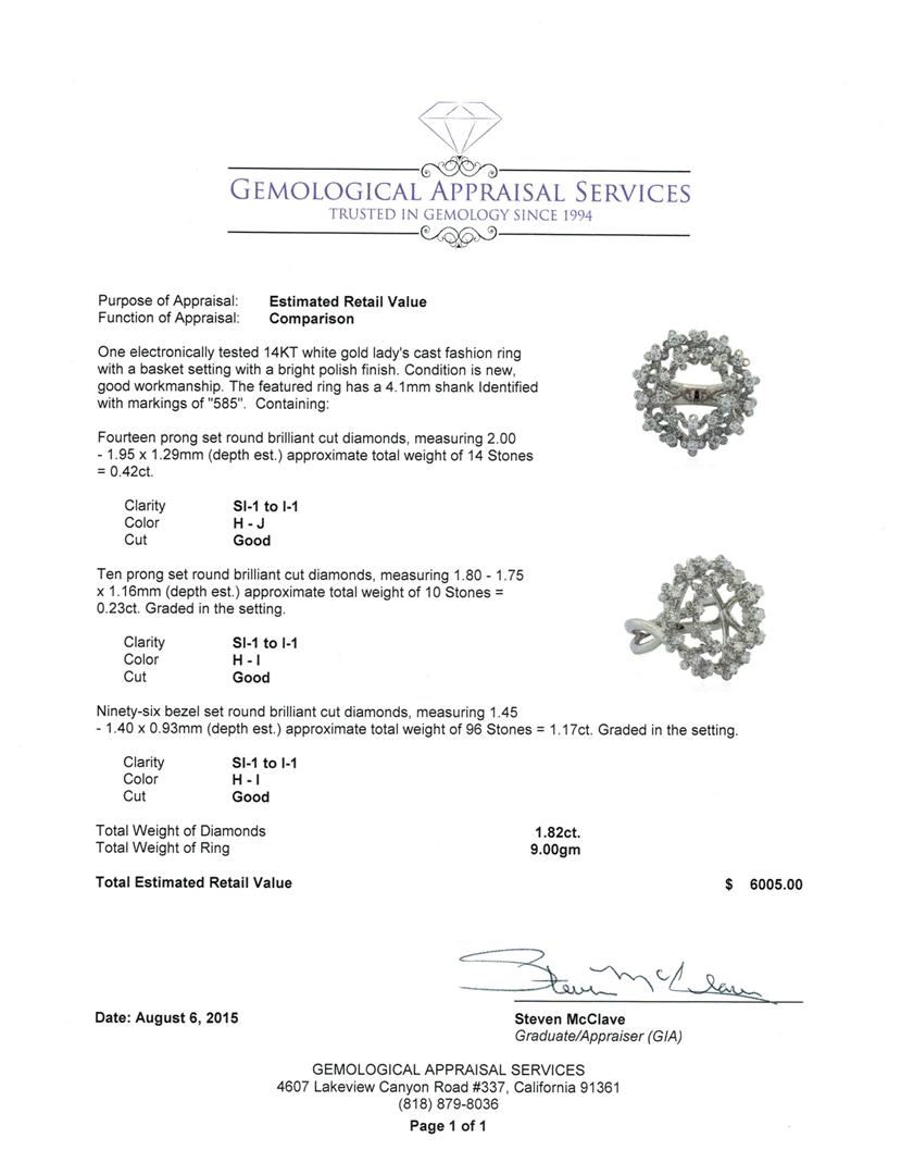 One electronically tested 14KT white gold lady's cast fashion ring with a basket setting with a bright polish finish. The featured ring has a 4.1mm shank Identified with markings of "585". Condition is new, good workmanship. Containing: Fourteen prong set round brilliant cut diamonds, measuring 2.00 - 1.95 x 1.29mm (depth est.) approximate. Total Weight of 14 Stones = 0.42ct. Clarity: SI-1 to I-1. Color: H - Good Ten prong set round brilliant cut diamonds, measuring 1.80 - 1.75 x 1.16mm (depth est.) approximate. Total Weight of 10 Stones = 0.23ct. Graded in the setting. Clarity: SI-1 to I-1. Color: H - I. Cut Good Ninety-Six bezel set round brilliant cut diamonds, measuring 1.45 - 1.40 x 0.93mm (depth est.) approximate. Total Weight of 96 Stones = 1.17ct. Graded in the setting. Clarity: SI-1 to I-1. Color: H - I. Cut Good. Total Weight of Diamonds 1.82ct. Total Weight of Ring 9.00gm. GAS Appraised at $6,005.00.