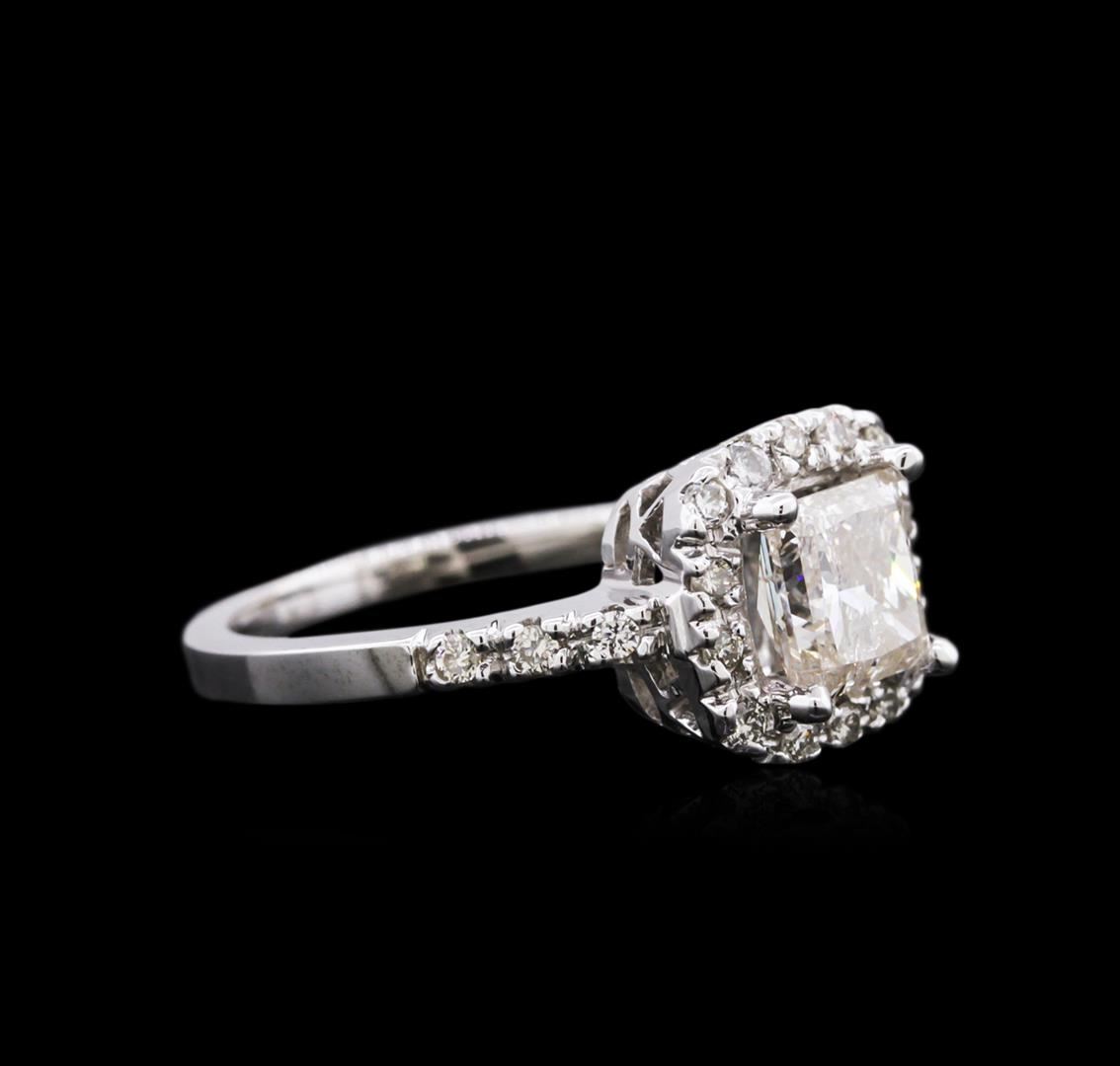 One electronically tested 14KT white gold ladies cast diamond engagement ring with a bright polish finish. Identified with markings of "14K". Condition is new. Containing: One prong set princess cut diamond, measuring 6.00 x 6.00 x 4.50mm (depth est.) approximate weight of 1.52ct. Clarity: I-2. Color: L, Cut is Good. Twenty prong set round brilliant cut diamonds, measuring 1.50 - 1.50 x 0.90mm (depth est.) approximate total weight of 20 Stones = 0.30ct. Clarity: SI-2 to I-1. Color: I - J, Cut is Good. Diamonds are graded in the mounting, unless otherwise stated. Total Weight of Diamonds 1.82ct. Total Weight of Engagement Ring 4.50 grams. GGL Appraised at $5,580.00.