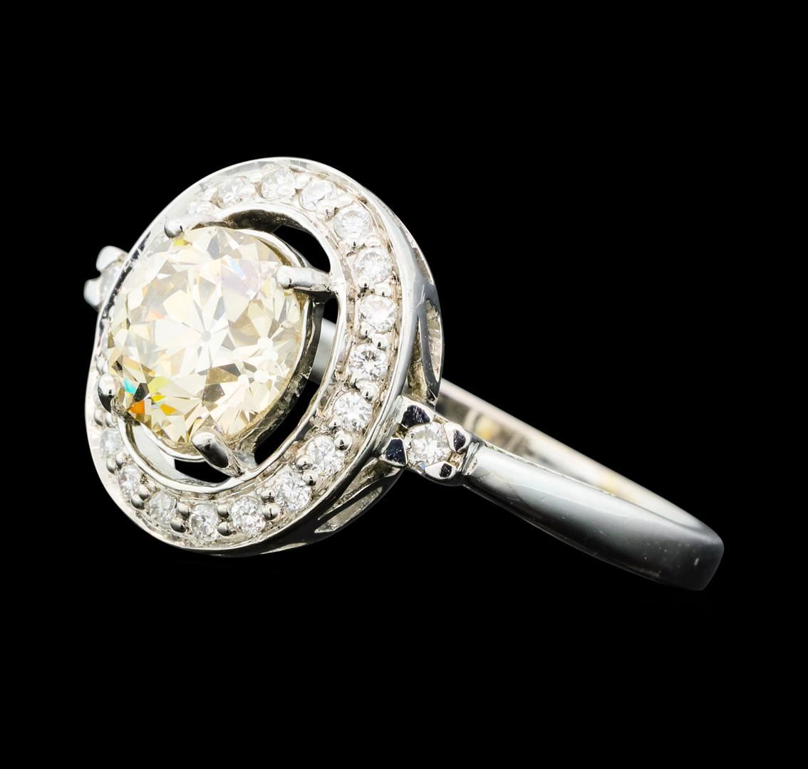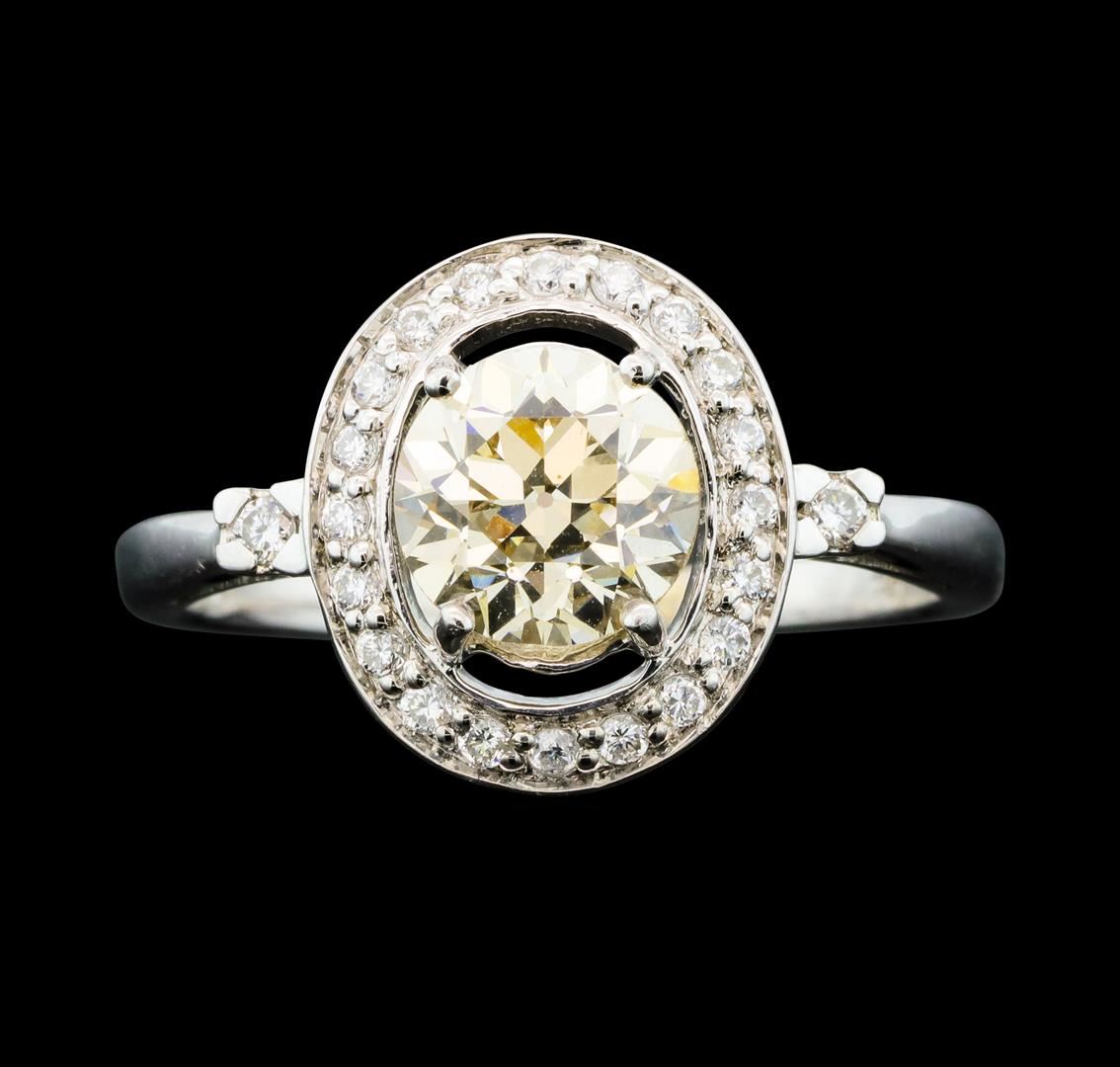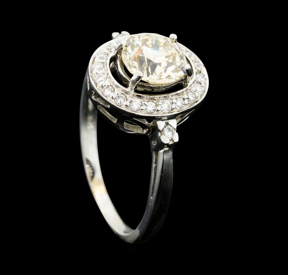 One electronically tested 18KT white gold lady's cast wedding ring with a cathedral halo with a bright polish finish. The featured lady's ring has a shank measuring 1.64 millimeters wide. Identified with markings of '18K'. Condition is new, good workmanship. Containing: One prong set Old European cut diamond, measuring 7.06 - 6.93 x 4.51mm (depth est.) , 10.00.%. GTCF approximate weight of 1.50ct. Graded in the setting. Clarity VS-1. Color: R - S Cut Very Good Two prong set round brilliant cut diamonds, measuring 1.80 - 1.70 x 1.09mm (depth est.) approximate total weight of 2 Stones = 0.04ct. Graded in the setting. Clarity VS-2 to SI-1. Color: H - I Cut Very Good Twenty prong set round brilliant cut diamonds, measuring 1.60 - 1.50 x 0.96mm (depth est.) approximate total weight of 20 Stones = 0.28ct. Graded in the setting. Clarity VS-2 to SI-1. Color: H - I Cut Good. Total Weight of Diamonds 1.82ct.. Total Weight of Ring 2.00gm GAS Appraised at $18,230.00.