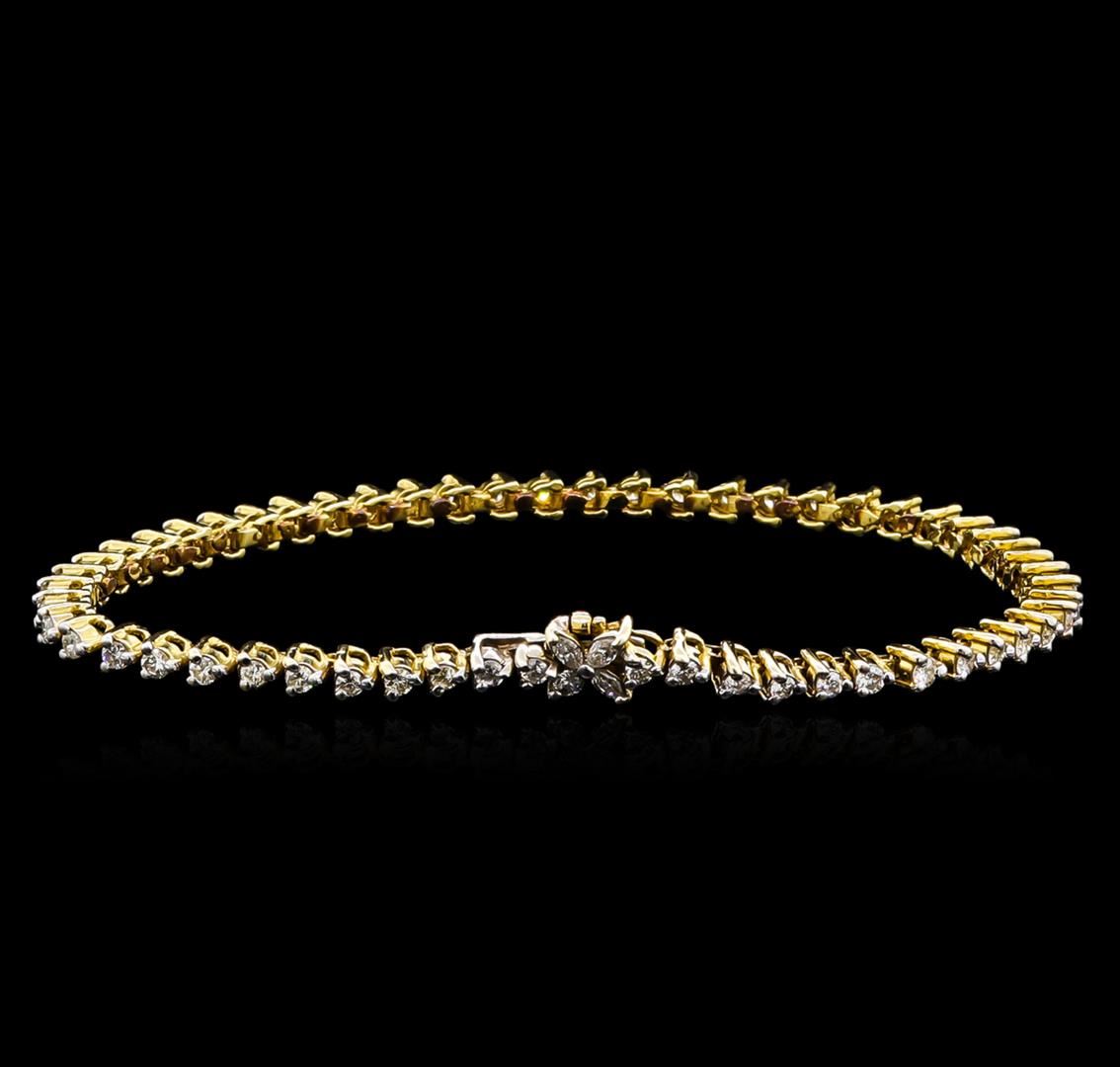 One electronically tested 14KT yellow gold ladies cast & assembled diamond tennis bracelet. Seven and one-half inch length bracelet composed of a flexible ribbon of diamonds, terminating in a diamond floret concealed clasp with safety. Identified with markings of "14K". Condition is good. Tennis bracelets & necklaces got their unusual name from an incident involving the U.S. professional tennis player Chris Evert during a tennis match in the 1980's. Evert had been wearing an expensive diamond bracelet, an inline string of individually-set diamonds. Previously these bracelets were known as eternity bracelets. When the clasp snapped during play, she asked the officials to stop the tennis match until the bracelet could be found. Since that day, bracelets and necklaces featuring an inline string of diamonds have been called tennis bracelets and tennis necklaces. Containing: Four prong set marquise shaped cut diamonds, measuring 2.90 x 1.90 x 1.19mm (depth est.) approximate total weight of 4 Stones = 0.17ct. Measurements are an average for the group. Graded in the setting. Clarity: I-1 to I-2. Color: G - H Fifty-Six prong set round brilliant cut diamonds, measuring 2.00 - 2.00 x 1.20mm (depth est.) approximate total weight of 56 Stones = 1.65ct. Graded in the setting. Clarity: SI-2 to I-2. Color: F - H. Total Weight of Diamonds 1.82ct. Total Weight of Bracelet 10.22gm. AIG Appraised at $6,270.00.
