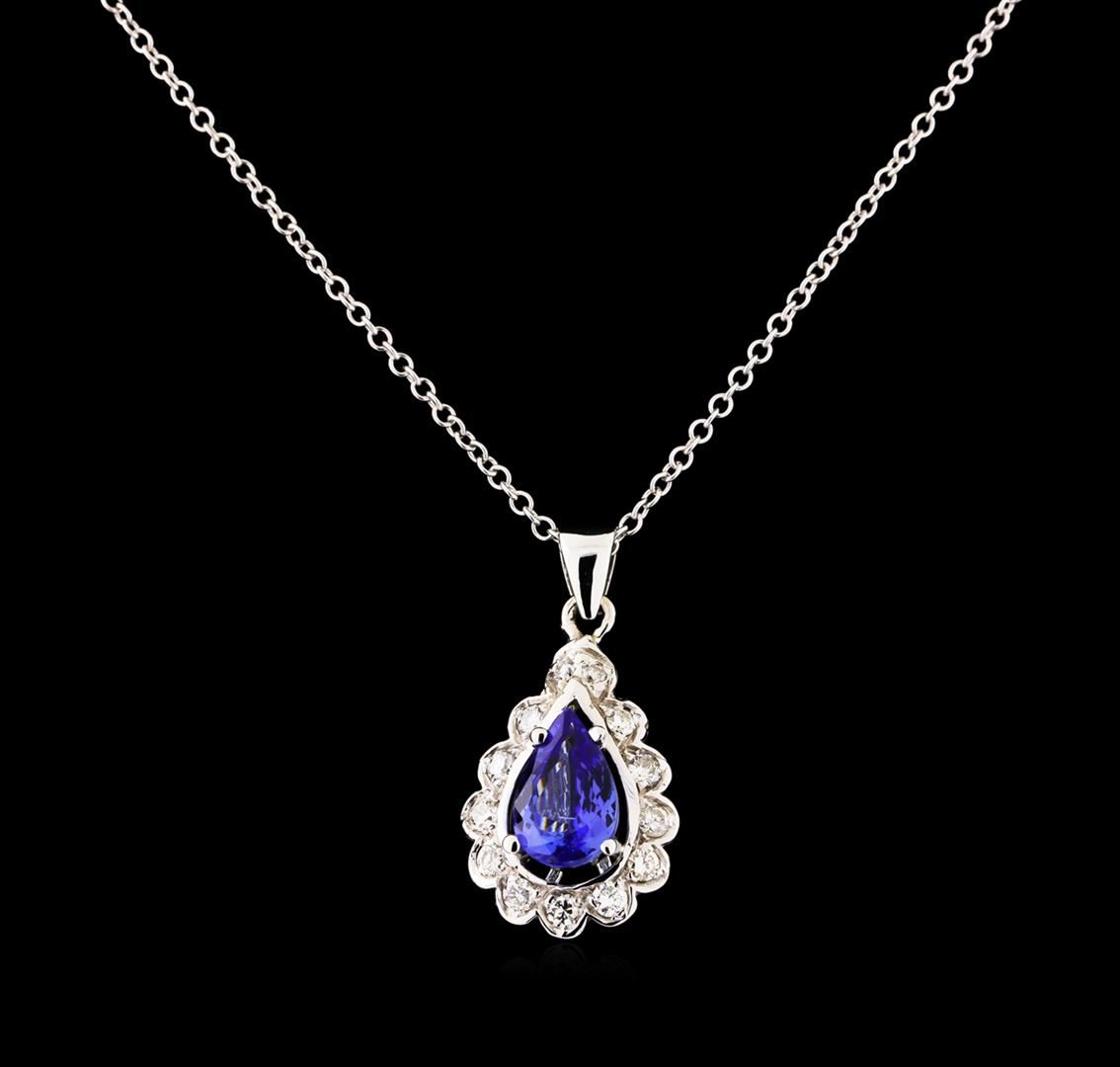 One electronically tested 14KT white gold lady's combination cast & assembled fashion pendant & chain 18.0" long, 1.5mm round cable link with a lobster claw clasp with a bright polish finish. Identified with markings of "14K". Condition is new, good workmanship. Containing: One prong set pear modified brilliant cut natural tanzanite, measuring 10.03 x 6.59 x 4.28mm, approximate weight of 1.82ct., clarity is eye clean, medium, moderately strong, violetish blue color, (GIA vB 5/4), cut is very good. Transmitting light with no distortion, transparent. Colored gemstones are presumed to have been subjected to commonly used enhancement processes. Graded in the setting. Eleven prong set round brilliant cut diamonds, measuring 2.10 - 2.00 x 1.27mm (depth est.) approximate total weight of 11 Stones = 0.37ct. Graded in the setting. Clarity: SI-1 to SI-2. Color: H - I. Cut Good Two prong set round brilliant cut diamonds, measuring 1.50 - 1.40 x 0.90mm (depth est.) approximate total weight of 2 Stones = 0.02ct. Graded in the setting. Clarity: SI-1 to SI-2. Color: H - I. Cut Good. Total Weight of Colored Stones 1.82ct. Total Weight of Diamonds 0.39ct. Total Weight of Pendant & Chain 5.10gm. GAS Appraised at $4,445.00.