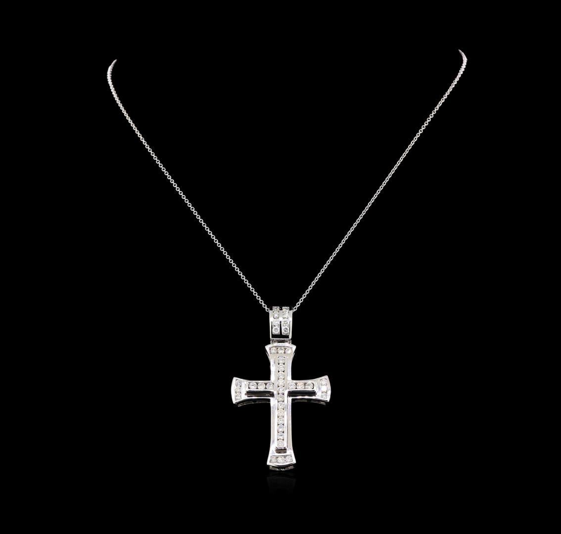 One electronically tested 14KT white gold cast & assembled diamond cross pendant with chain. The two inch length pendant features a diamond set tiered cross supported by an elaborate lattice under gallery, completed by a diamond set bail. The pendant is supported by a sixteen inch length 14KT white gold cable chain, terminating in a lobster claw clasp. Condition is new, good workmanship. Containing: Eighteen channel set round brilliant cut diamonds, measuring 2.50 - 2.50 x 1.50mm (depth est.) approximate total weight of 18 Stones = 1.05ct. Graded in the setting. Clarity: SI-2 to I-1. Color: G - I Twenty channel set round brilliant cut diamonds, measuring 2.20 - 2.20 x 1.32mm (depth est.) approximate total weight of 20 Stones = 0.78ct. Graded in the setting. Clarity: SI-2 to I-1. Color: G - I. Total Weight of Diamonds 1.83ct. Total Weight of Pendant With Chain 17.27gm. AIG Appraised at $7,755.00.