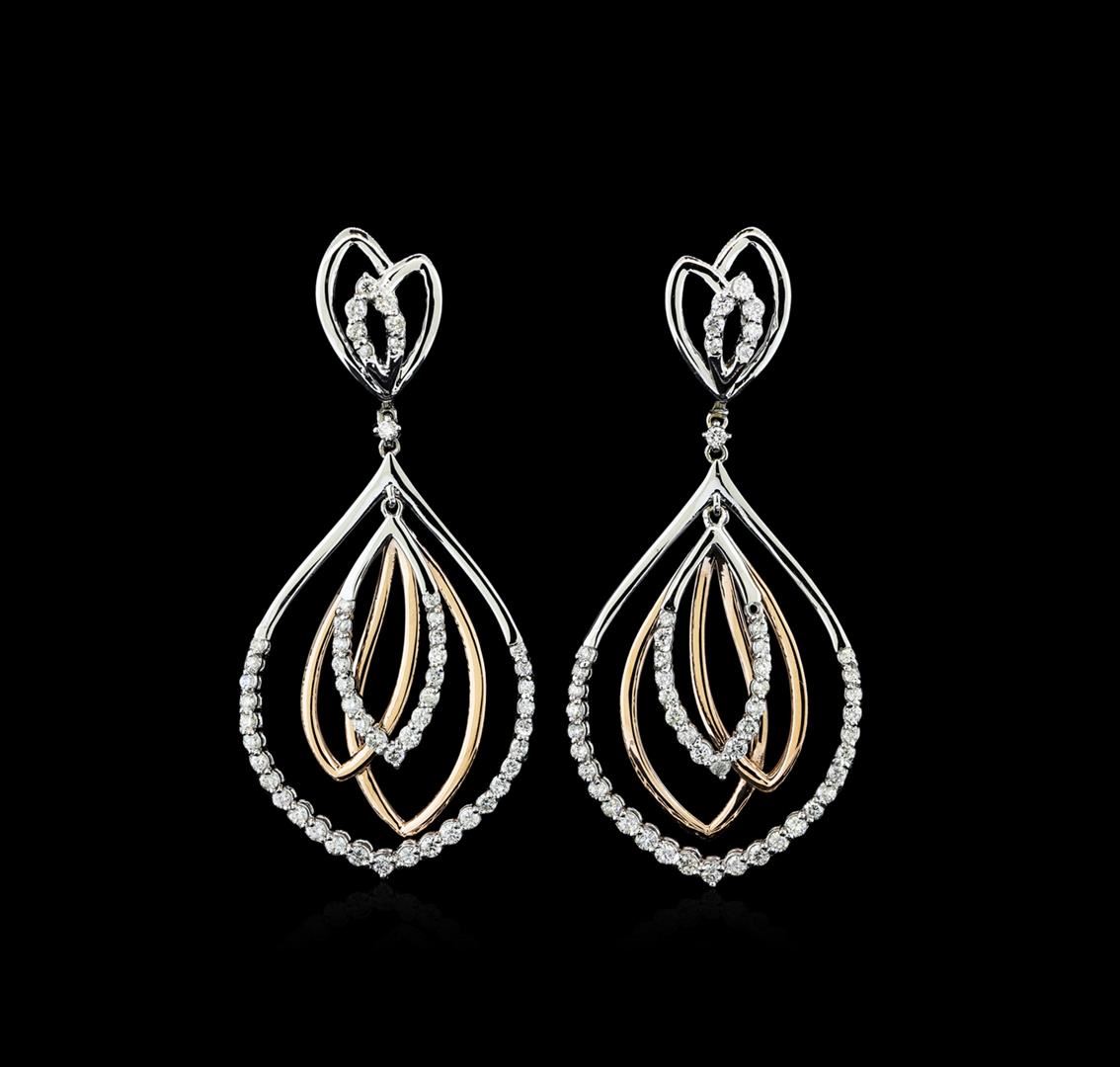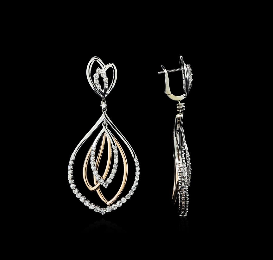 One pair electronically tested 14KT rose and white gold lady's combination cast & assembled fashion earrings with hinged clip backs with a bright polish finish. The featured lady's earrings have a drop of 58 millimeters. Identified with markings of 'K14'. Condition is new, good workmanship. Containing: Fifty-Six prong set round brilliant cut diamonds, measuring 1.90 - 1.70 x 1.12mm (depth est.) approximate total weight of 56 Stones = 1.27ct. Graded in the setting. Clarity SI-1 to I-1. Color: G - H Cut Good Forty-Eight prong set round brilliant cut diamonds, measuring 1.50 - 1.40 x 0.90mm (depth est.) approximate total weight of 48 Stones = 0.56ct. Graded in the setting. Clarity SI-1 to SI-2. Color: G - H Cut Good. Total Weight of Diamonds 1.83ct.. Total Weight of Earrings 15.90gm GAS Appraised at $7,545.00.