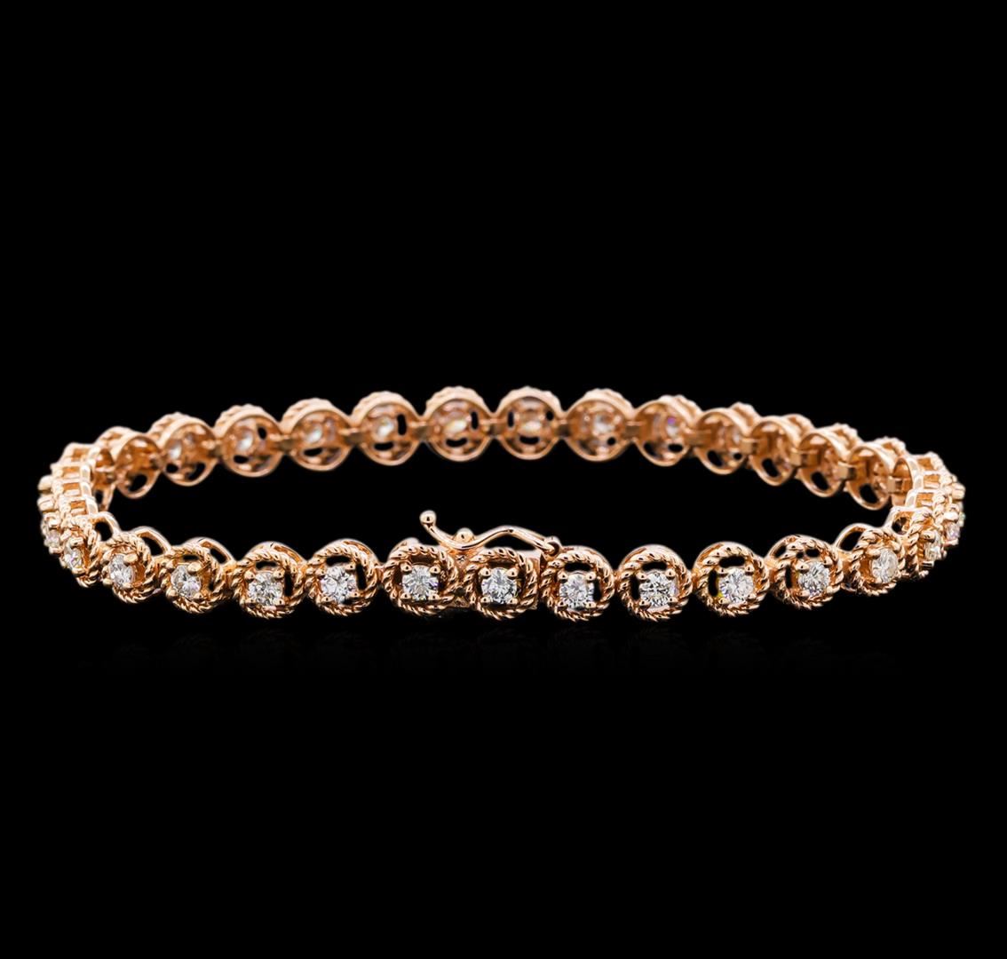 One electronically tested 14KT rose gold lady's combination cast & assembled fashion tennis bracelet with a tongue clasp with foldover safety with a bright polish finish. The featured lady's bracelet measures 7 inches in length. Identified with markings of "K14". Condition is new, good workmanship. Containing: Thirty-Three prong set round brilliant cut diamonds, measuring 2.50 - 2.40 x 1.52mm (depth est.) approximate total weight of 33 Stones = 1.83ct. Graded in the setting. Clarity: SI-1 to SI-2. Color: H - I. Cut Good. Total Weight of Diamonds 1.83ct. Total Weight of Tennis Bracelet 11.80gm. GAS Appraised at $6,170.00.