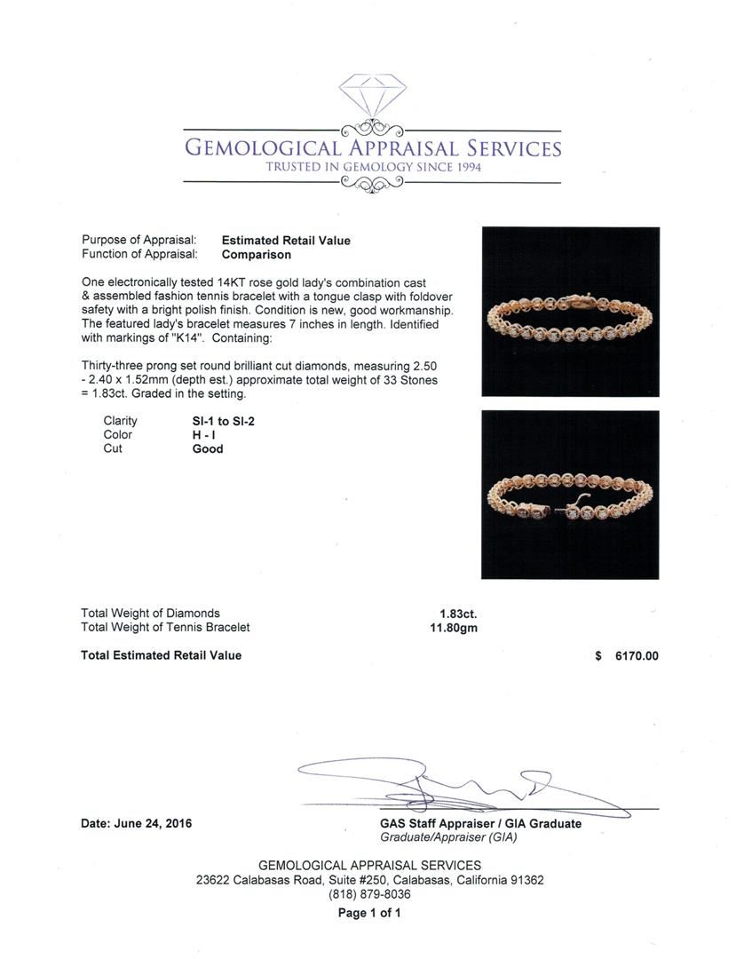 One electronically tested 14KT rose gold lady's combination cast & assembled fashion tennis bracelet with a tongue clasp with foldover safety with a bright polish finish. The featured lady's bracelet measures 7 inches in length. Identified with markings of "K14". Condition is new, good workmanship. Containing: Thirty-Three prong set round brilliant cut diamonds, measuring 2.50 - 2.40 x 1.52mm (depth est.) approximate total weight of 33 Stones = 1.83ct. Graded in the setting. Clarity: SI-1 to SI-2. Color: H - I. Cut Good. Total Weight of Diamonds 1.83ct. Total Weight of Tennis Bracelet 11.80gm. GAS Appraised at $6,170.00.