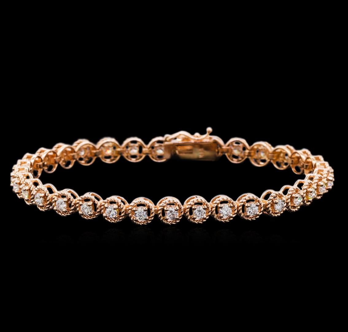 One electronically tested 14KT rose gold lady's combination cast & assembled fashion tennis bracelet with a tongue clasp with foldover safety with a bright polish finish. The featured lady's bracelet measures 7 inches in length. Identified with markings of "K14". Condition is new, good workmanship. Containing: Thirty-Three prong set round brilliant cut diamonds, measuring 2.50 - 2.40 x 1.52mm (depth est.) approximate total weight of 33 Stones = 1.83ct. Graded in the setting. Clarity: SI-1 to SI-2. Color: H - I. Cut Good. Total Weight of Diamonds 1.83ct. Total Weight of Tennis Bracelet 11.80gm. GAS Appraised at $6,170.00.