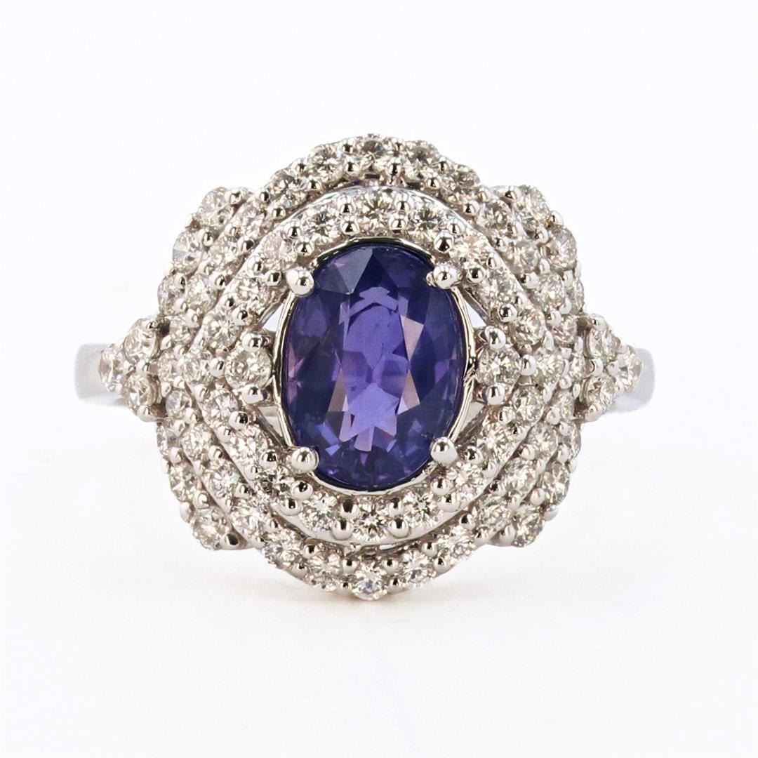 1.83ct UNHEATED Purple Sapphire and 0.89ctw Diamond Platinum Ring (GIA CERTIFIED). One polished, stamped, and tested platinum ring marked Oscar Friedman. The ring is mounted with: 1 genuine GIA certified unheated sapphire center stone weighing 1.83 carats, and 68 genuine round diamonds weighing approximately 0.89 carats. This item weighs 7.8 grams, condition is new, excellent workmanship. MAIN GEMSTONE GIA Report No.: 2225720434 Species: Natural Corundum Variety: Natural Sapphire Shape: Oval Cutting Style: Brilliant Cut Crown, Step Cut Pavilion Measurements: 8.27 x 5.90 x 4.21mm Weight: 1.83 carats Color: Purple Transparency: Transparent Treatment: None Refractive Index: 1.762 - 1.770 DR Birefringence: 0.008 - 0.010 Hardness: 9 ADJACENT GEMSTONES ON RING Identity: Natural Diamond Shape: Round Cutting Style: Brilliant Cut Quantity: 68 Diamonds Measurements: 1.3 - 1.8mm Total Weight: 0.89 carats Clarity Grade: VS2 - SI1 Color Grade: F - G Refractive Index: 2.417 Hardness: 10 SAPPHIRE WEIGHT: 1.83 ct TOTAL DIAMOND WEIGHT: 0.89 cts WEIGHT OF ITEM: 7.8 grams METAL: Platinum
