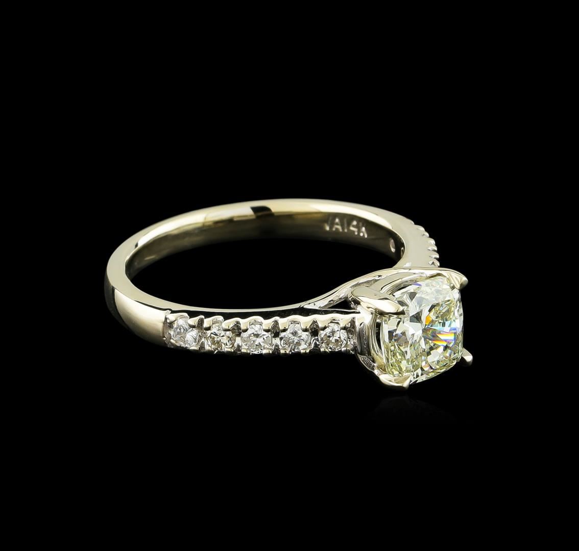One electronically tested 14KT white gold ladies cast diamond unity ring with a bright polish finish. The featured diamond is supported by diamond ribbon shoulders, completed by a two millimeter wide band. Identified with markings of "14K". Condition is new, good workmanship. Containing: One prong set cushion cut diamond, measuring 6.20 x 6.20 x 4.50mm (depth est.), 5.00.%. GTCF approximate weight of 1.53ct. Graded in the setting. Clarity: SI-2. Depth: 72.6%. Table 71.0%. Ten prong set round brilliant cut diamonds, measuring 2.00 - 1.90 x 1.17mm (depth est.) approximate total weight of 10 Stones = 0.30ct. Graded in the setting. Clarity: SI-2 to I-2. Color: G - I. Total Weight of Diamonds 1.83ct. Total Weight of Ring 3.76gm. AIG Appraised at $9,085.00.