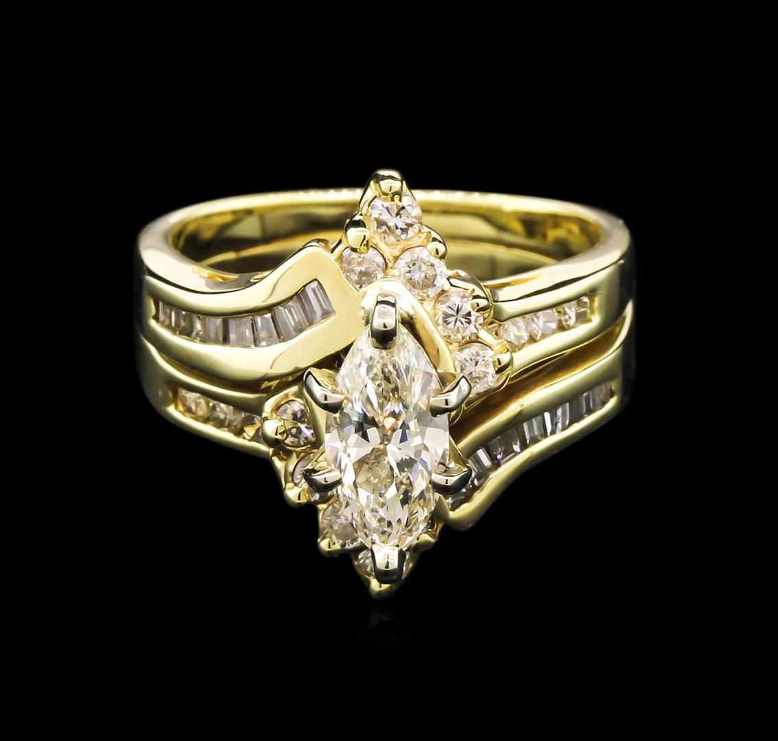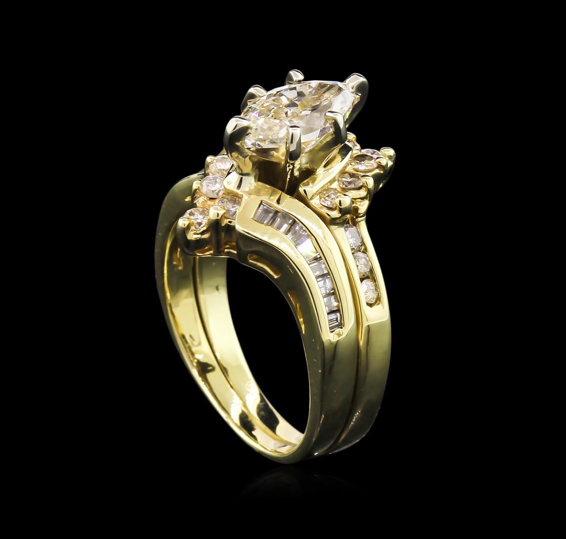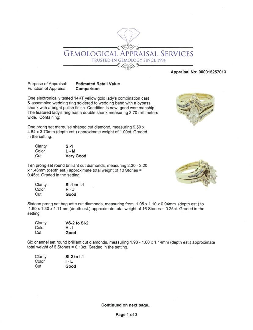 One electronically tested 14KT yellow gold lady's combination cast & assembled wedding ring soldered to wedding band with a bypass shank with a bright polish finish. The featured lady's ring has a double shank measuring 3.70 millimeters wide. Condition is new, good workmanship. Containing: One prong set marquise shaped cut diamond, measuring 9.50 x 4.64 x 3.70mm (depth est.) approximate weight of 1.00ct. Graded in the setting. Clarity: SI-1. Color: L - Very Good Ten prong set round brilliant cut diamonds, measuring 2.30 - 2.20 x 1.46mm (depth est.) approximate total weight of 10 Stones = 0.45ct. Graded in the setting. Clarity: SI-1 to I-1. Color: H - Good Sixteen prong set baguette cut diamonds, measuring from 1.05 x 1.10 x 0.94mm (depth est.) to 1.60 x 1.30 x 1.11mm (depth est.) approximate total weight of 16 Stones = 0.25ct. Graded in the setting. Clarity: VS-2 to SI-2. Color: H - I. Cut Good Six channel set round brilliant cut diamonds, measuring 1.90 - 1.60 x 1.14mm (depth est.) approximate total weight of 6 Stones = 0.13ct. Graded in the setting. Clarity: SI-2 to I-1. Color: I - L. Cut Good. Total Weight of Diamonds 1.83ct. Total Weight of Ring Soldered To Wedding Band 7.60gm. GAS Appraised at $6,965.00.