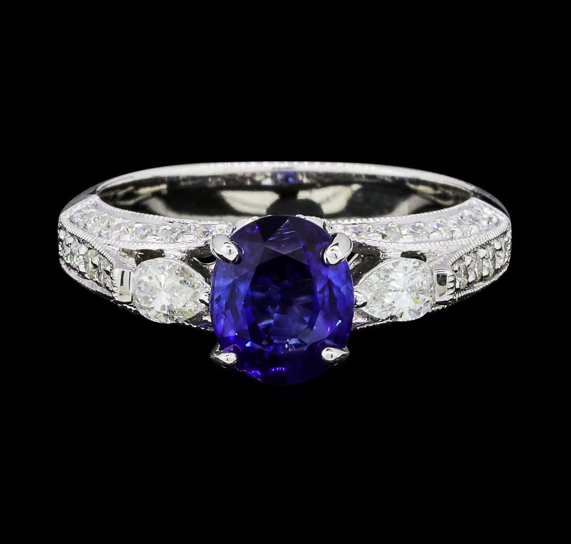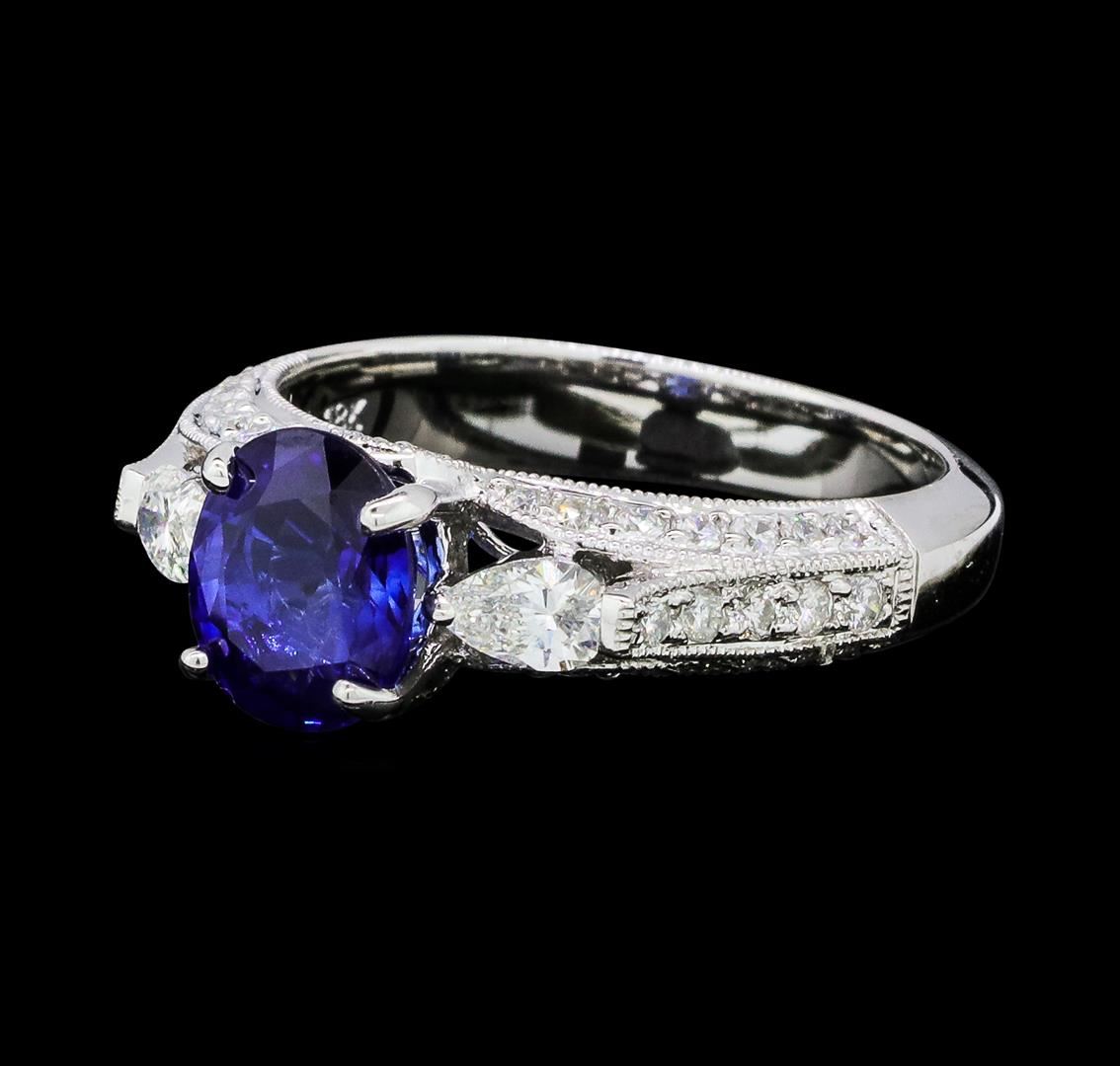 One electronically tested 18KT white gold lady's cast fashion ring with a cathedral shank with a bright polish with milgrain detailing finish. The featured lady's ring has a shank measuring 3.30 millimeters wide. Identified with markings of '18K'. Condition is new, good workmanship. Containing: One prong set oval modified mixed cut natural blue sapphire, measuring 7.84 x 6.50 x 4.23mm, (depth est.) approximate weight of 1.84ct., clarity is slightly included, medium, moderately strong, very slightly greenish blue color, (GIA vslgB 5/4), cut is good. Transmitting light with a minimum of distortion, transparent. Colored gemstones are presumed to have been subjected to commonly used enhancement processes. Graded in the setting. Two prong set pear shaped cut diamonds, measuring 4.45 x 2.85 x 1.80mm (depth est.) approximate total weight of 2 Stones = 0.27ct. Graded in the setting. Color G - H Clarity SI-1 to SI-2 Cut Good Thirty-Eight prong set round brilliant cut diamonds, measuring 1.60 - 1.40 x 0.93mm (depth est.) approximate total weight of 38 Stones = 0.53ct. Graded in the setting. Color G - H Clarity SI-1 to I-1 Cut Good Twelve prong set round brilliant cut diamonds, measuring 1.00 - 0.95 x 0.61mm (depth est.) approximate total weight of 12 Stones = 0.05ct. Color G - H Clarity SI-1 to SI-2 Cut Good. Total Weight of Colored Stones 1.84ct.. Total Weight of Diamonds 0.85ct.. Total Weight of Ring 6.00gm GAS Appraised at $4995.00. GAS Appraised at $4,995.00.