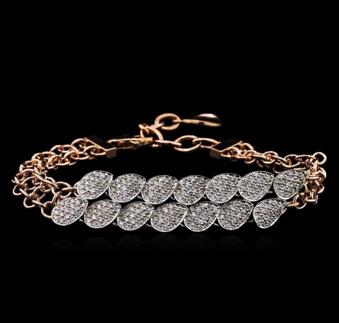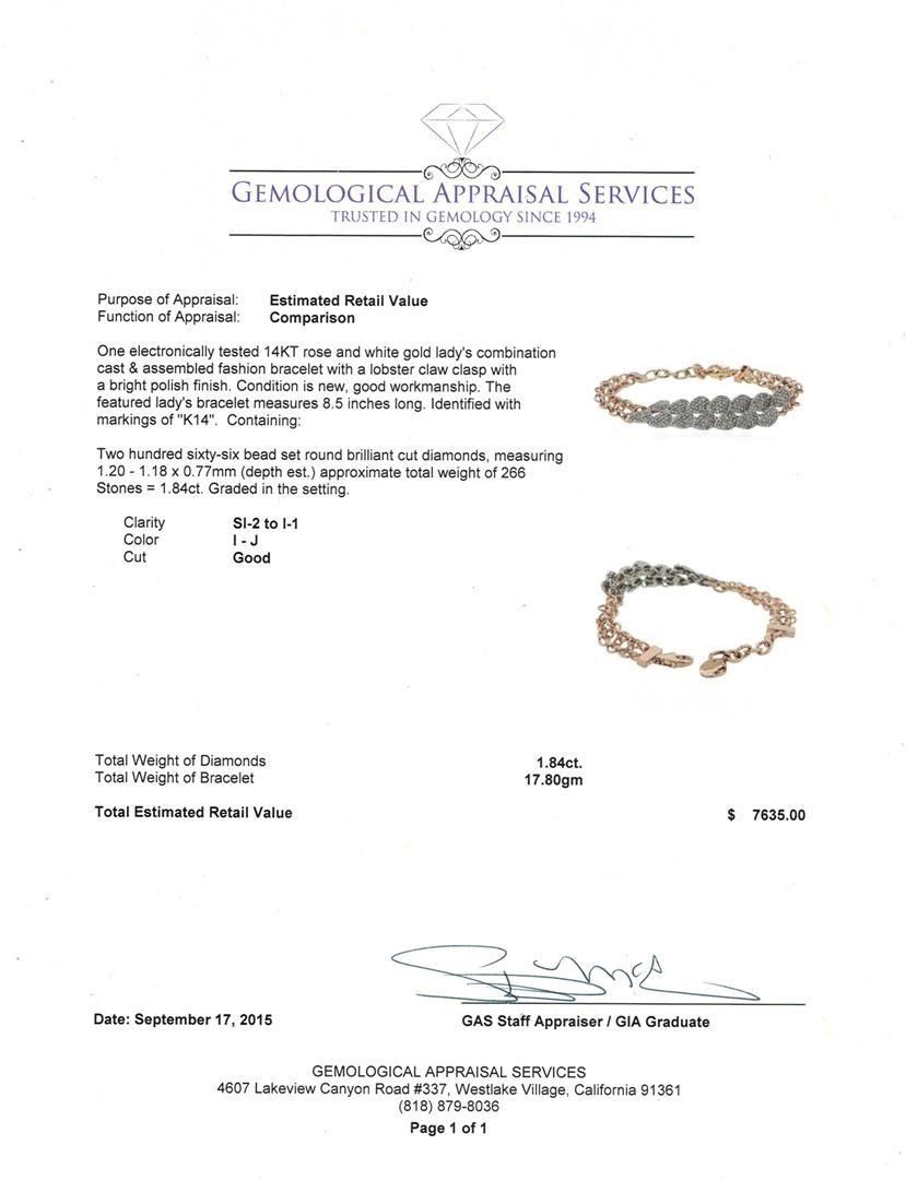 One electronically tested 14KT rose and white gold lady's combination cast & assembled fashion bracelet with a lobster claw clasp with a bright polish finish. The featured lady's bracelet measures 8.5 inches long. Identified with markings of "K14". Condition is new, good workmanship. Containing: Two Hundred Sixty-Six bead set round brilliant cut diamonds, measuring 1.20 - 1.18 x 0.77mm (depth est.) approximate total weight of 266 Stones = 1.84ct. Graded in the setting. Clarity: SI-2 to I-1. Color: I - Good. Total Weight of Diamonds 1.84ct. Total Weight of Bracelet 17.80gm. GAS Appraised.