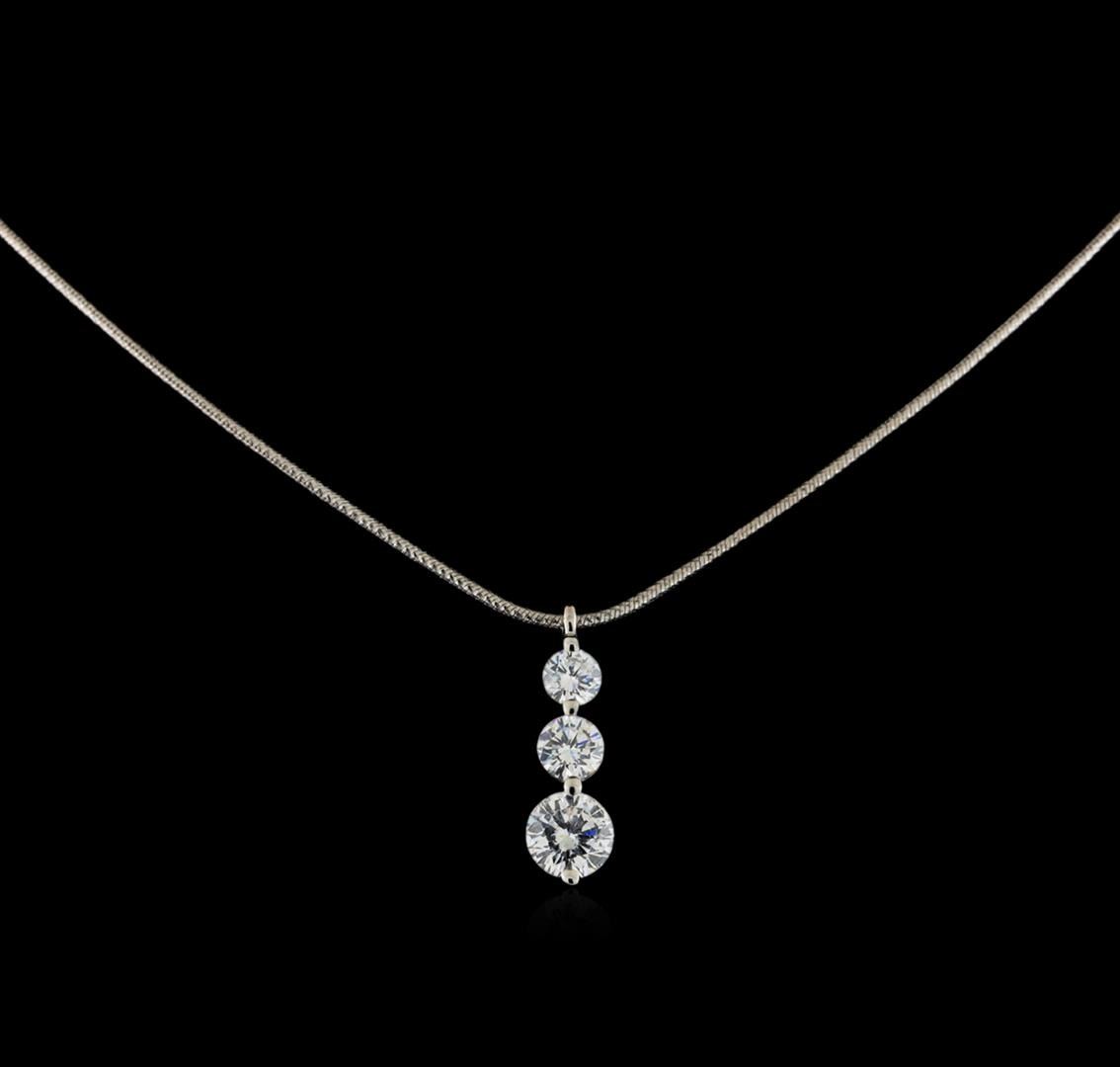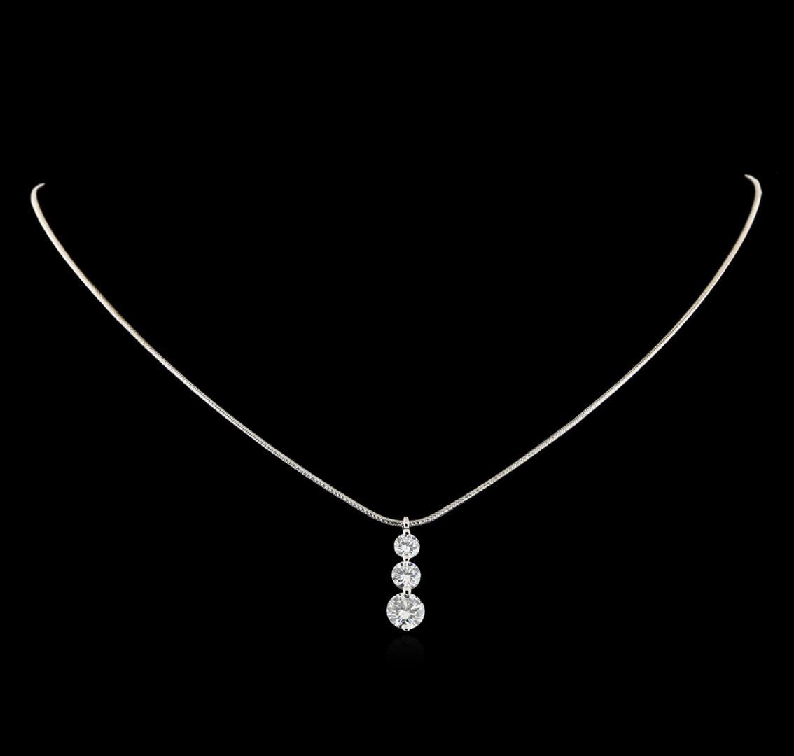 One electronically tested 14KT white gold ladies cast & assembled diamond pendant with chain. The pendant features a series of three diamonds, completed by a stationary white gold bail. The pendant is supported by a sixteen inch length 14KT white gold snake chain, terminating in a lobster claw clasp. Bright polish finish. Identified with markings of "14K". Condition is good. Containing: One prong set round brilliant cut diamond, measuring 6.25 - 6.24 x 3.72mm (depth est.) approximate weight of 0.98ct with a faint blue fluorescence. Graded in the setting. Clarity: I-1. Color: F One prong set round brilliant cut diamond, measuring 4.85 - 4.84 x 2.91mm (depth est.) approximate weight of 0.51ct. Graded in the setting. Clarity: SI-2. Color: G One prong set round brilliant cut diamond, measuring 4.32 - 4.30 x 2.55mm (depth est.) approximate weight of 0.35ct with a medium blue fluorescence. Graded in the setting. Clarity: SI-2. Color: G. Total Weight of Diamonds 1.84ct. Total Weight of Pendant With Chain 6.55gm. AIG Appraised at $16,565.00.