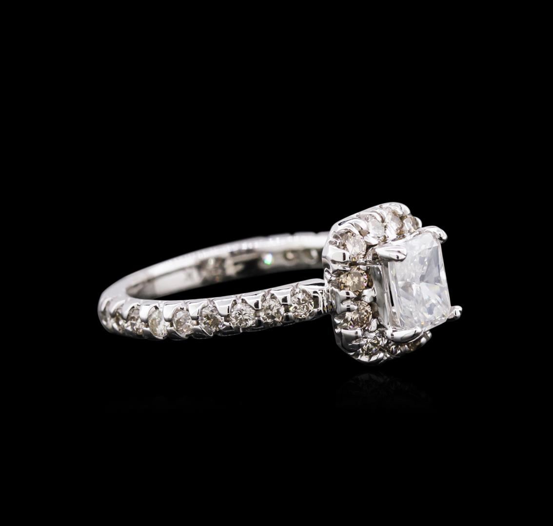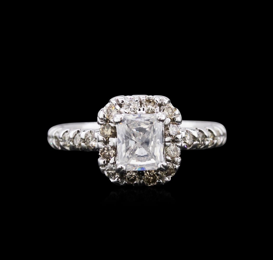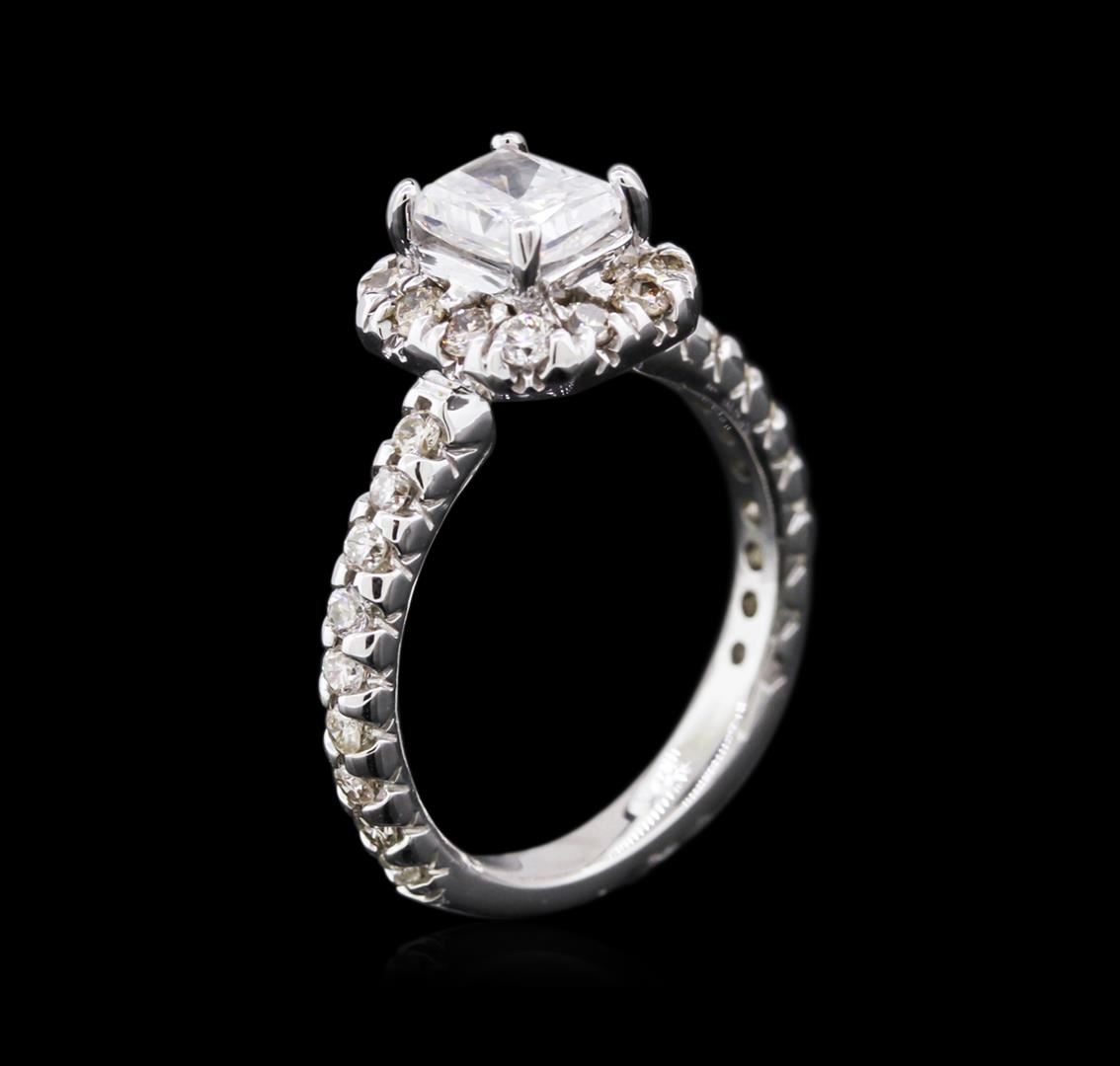 One electronically tested 14KT white gold ladies cast diamond engagement ring with a bright polish finish. Identified with markings of "14K". Condition is new. Containing: One prong set radiant shaped cut diamond, measuring 6.20 x 5.20 x 3.90mm (depth est.) approximate weight of 1.02ct. Clarity: SI-1. Color: K, Cut is Good. Thirty prong set round brilliant cut diamonds, measuring 1.80 - 1.80 x 1.08mm (depth est.) approximate total weight of 30 Stones = 0.82ct. Clarity: I-1 to I-2. Color: J - K, Cut is Good. Diamonds are graded in the mounting, unless otherwise stated. Total Weight of Diamonds 1.84ct. Total Weight of Engagement Ring 4.60 grams. GGL Appraised at $7,945.00.