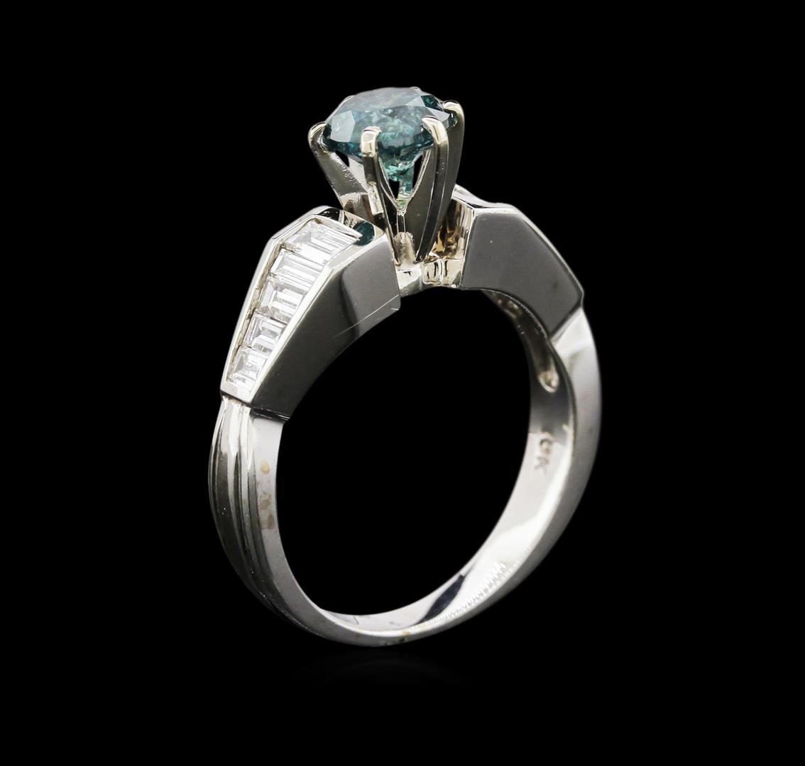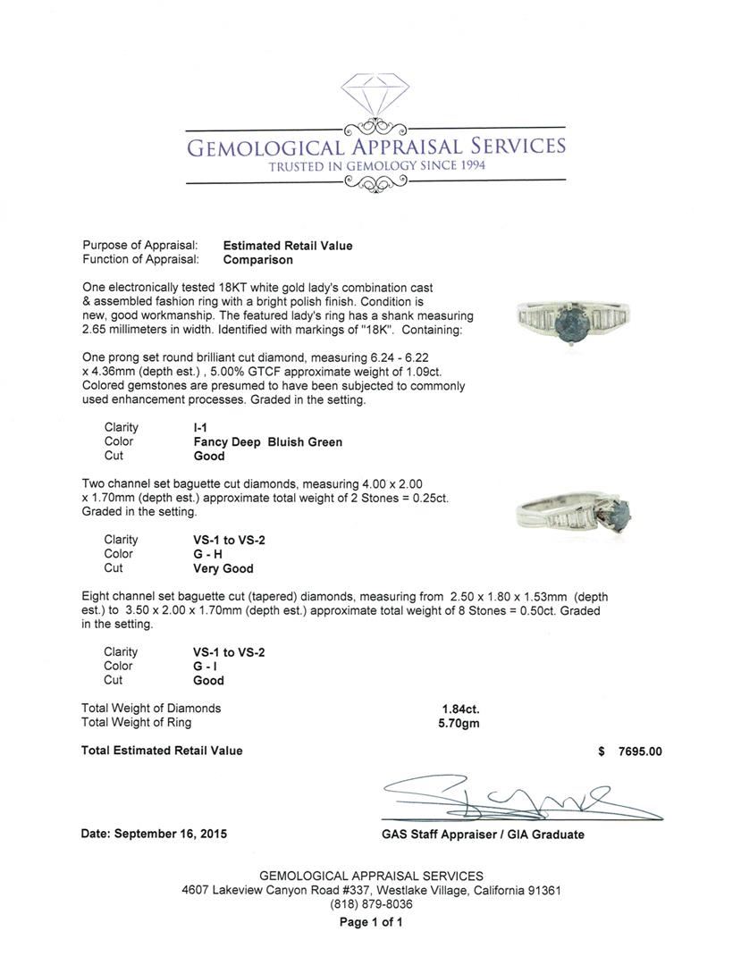 One electronically tested 18KT white gold lady's combination cast & assembled fashion ring with a bright polish finish. The featured lady's ring has a shank measuring 2.65 millimeters in width. Identified with markings of "18K". Condition is new, good workmanship. Containing: One prong set round brilliant cut diamond, measuring 6.24 - 6.22 x 4.36mm (depth est.) , 5.00.%. GTCF approximate weight of 1.09ct. Colored gemstones are presumed to have been subjected to commonly used enhancement processes. Graded in the setting. Clarity: I-1 Cut Good Two channel set baguette cut diamonds, measuring 4.00 x 2.00 x 1.70mm (depth est.) approximate total weight of 2 Stones = 0.25ct. Graded in the setting. Clarity: VS-1 to VS-2. Color: G - Very Good Eight channel set baguette cut (tapered) diamonds, measuring from 2.50 x 1.80 x 1.53mm (depth est.) to 3.50 x 2.00 x 1.70mm (depth est.) approximate total weight of 8 Stones = 0.50ct. Graded in the setting. Clarity: VS-1 to VS-2. Color: G - I. Cut Good. Total Weight of Diamonds 1.84ct. Total Weight of Ring 5.70gm. GAS Appraised at $7,695.00.