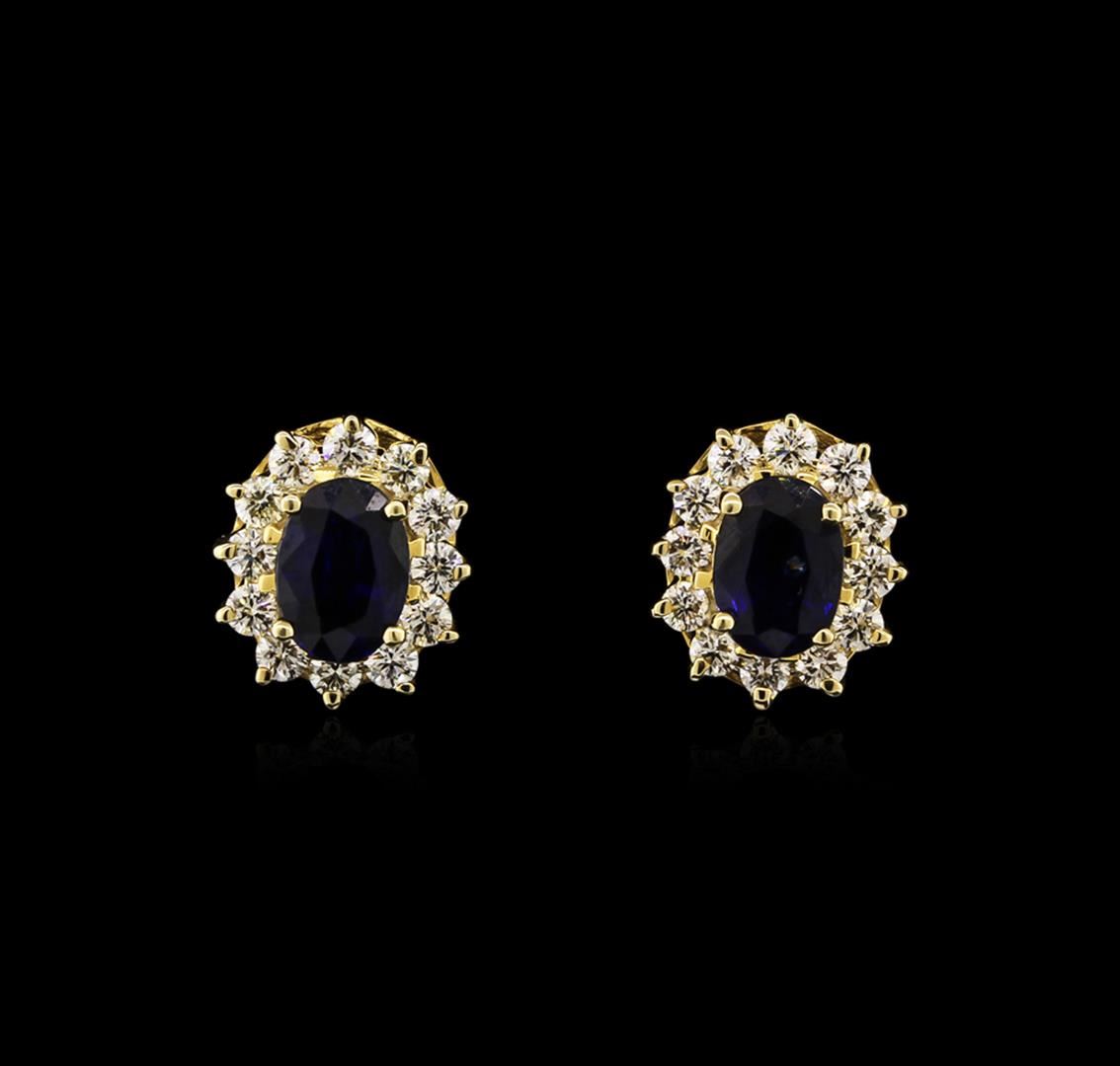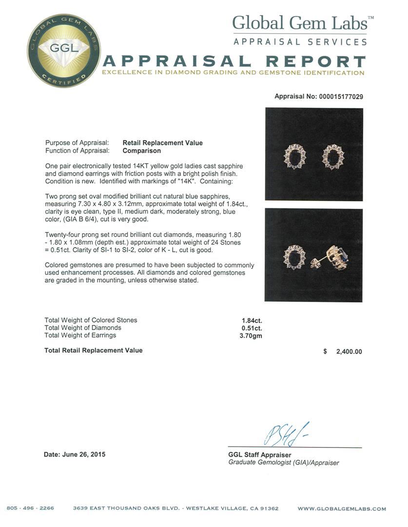 One pair electronically tested 14KT yellow gold ladies cast sapphire and diamond earrings with friction posts with a bright polish finish. Identified with markings of "14K". Condition is new. Containing: Two prong set oval modified brilliant cut natural blue sapphires, measuring 7.30 x 4.80 x 3.12mm, approximate total weight of 1.84ct., clarity is eye clean, type II, medium dark, moderately strong, blue color, (GIA B 6/4), cut is very good. Twenty-Four prong set round brilliant cut diamonds, measuring 1.80 - 1.80 x 1.08mm (depth est.) approximate total weight of 24 Stones = 0.51ct. Clarity: SI-1 to SI-2. Color: K - L, Cut is Good. Colored gemstones are presumed to have been subjected to commonly used enhancement processes. All diamonds and colored gemstones are graded in the mounting, unless otherwise stated. Total Weight of Colored Stones 1.84ct. Total Weight of Diamonds 0.51ct. Total Weight of Earrings 3.70 grams. GGL Appraised at $2,400.00.