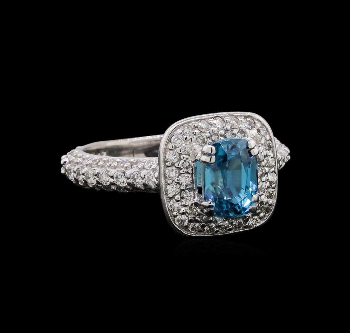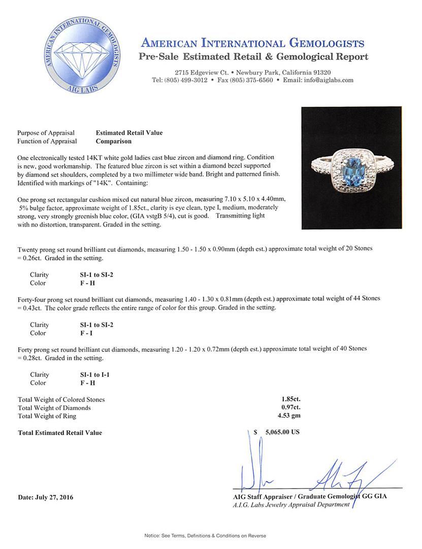 One electronically tested 14KT white gold ladies cast blue zircon and diamond ring. The featured blue zircon is set within a diamond bezel supported by diamond set shoulders, completed by a two millimeter wide band. Bright and patterned finish. Identified with markings of '14K'. Condition is new, good workmanship. Containing: One prong set rectangular cushion mixed cut natural blue zircon, measuring 7.10 x 5.10 x 4.40mm, 5%. bulge factor, approximate weight of 1.85ct., clarity is eye clean, type I, medium, moderately strong, very strongly greenish blue color, (GIA vstgB 5/4), cut is good. Transmitting light with no distortion, transparent. Graded in the setting. Twenty prong set round brilliant cut diamonds, measuring 1.50 - 1.50 x 0.90mm (depth est.) approximate total weight of 20 Stones = 0.26ct. Graded in the setting. Clarity SI-1 to SI-2. Color: F - H Forty-Four prong set round brilliant cut diamonds, measuring 1.40 - 1.30 x 0.81mm (depth est.) approximate total weight of 44 Stones = 0.43ct. The color grade reflects the entire range of color for this group. Graded in the setting. Clarity SI-1 to SI-2. Color: F - I Forty prong set round brilliant cut diamonds, measuring 1.20 - 1.20 x 0.72mm (depth est.) approximate total weight of 40 Stones = 0.28ct. Graded in the setting. Clarity SI-1 to I-1. Color: F - H. Total Weight of Colored Stones 1.85ct.. Total Weight of Diamonds 0.97ct.. Total Weight of Ring 4.53gm. AIG Appraised at $5,065.00.