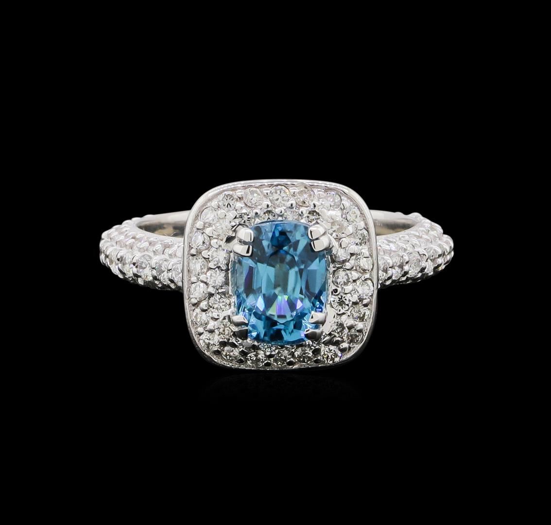 One electronically tested 14KT white gold ladies cast blue zircon and diamond ring. The featured blue zircon is set within a diamond bezel supported by diamond set shoulders, completed by a two millimeter wide band. Bright and patterned finish. Identified with markings of '14K'. Condition is new, good workmanship. Containing: One prong set rectangular cushion mixed cut natural blue zircon, measuring 7.10 x 5.10 x 4.40mm, 5%. bulge factor, approximate weight of 1.85ct., clarity is eye clean, type I, medium, moderately strong, very strongly greenish blue color, (GIA vstgB 5/4), cut is good. Transmitting light with no distortion, transparent. Graded in the setting. Twenty prong set round brilliant cut diamonds, measuring 1.50 - 1.50 x 0.90mm (depth est.) approximate total weight of 20 Stones = 0.26ct. Graded in the setting. Clarity SI-1 to SI-2. Color: F - H Forty-Four prong set round brilliant cut diamonds, measuring 1.40 - 1.30 x 0.81mm (depth est.) approximate total weight of 44 Stones = 0.43ct. The color grade reflects the entire range of color for this group. Graded in the setting. Clarity SI-1 to SI-2. Color: F - I Forty prong set round brilliant cut diamonds, measuring 1.20 - 1.20 x 0.72mm (depth est.) approximate total weight of 40 Stones = 0.28ct. Graded in the setting. Clarity SI-1 to I-1. Color: F - H. Total Weight of Colored Stones 1.85ct.. Total Weight of Diamonds 0.97ct.. Total Weight of Ring 4.53gm. AIG Appraised at $5,065.00.