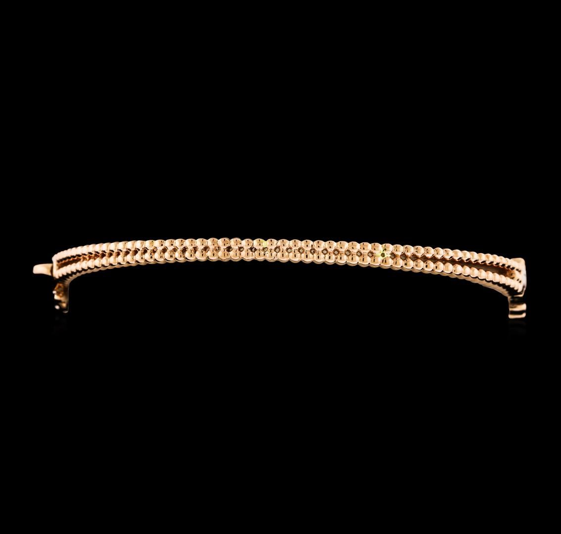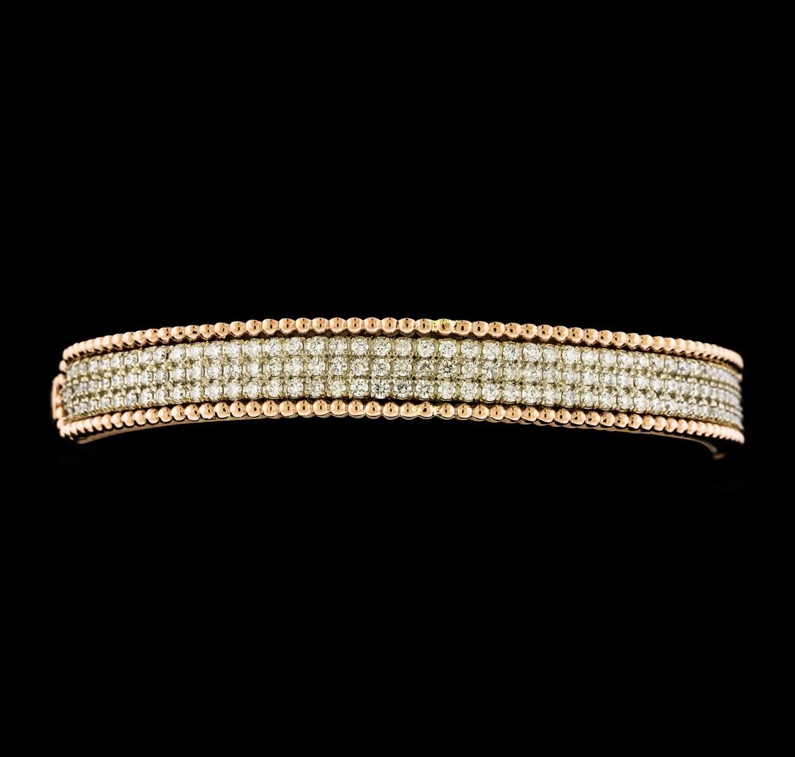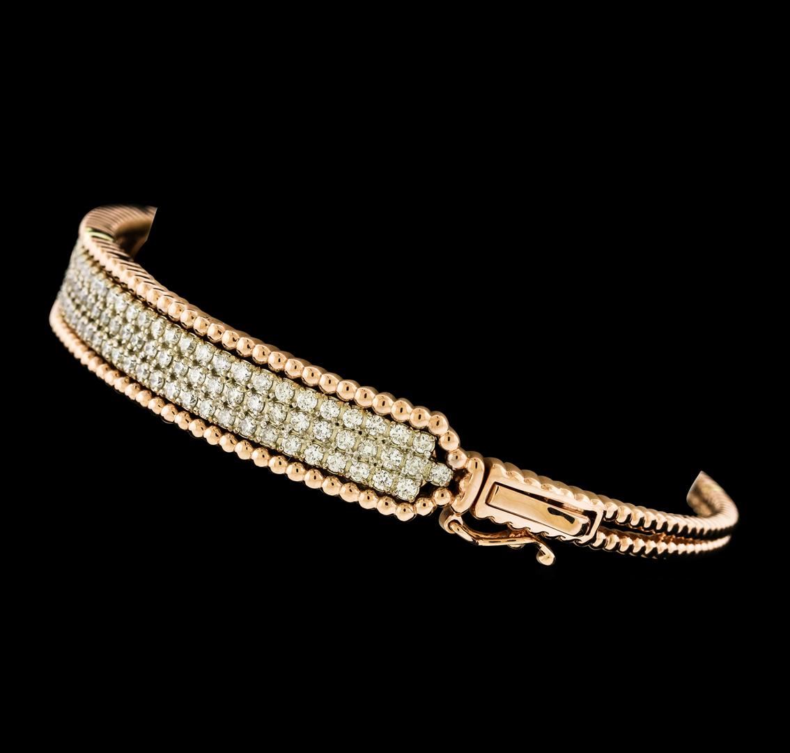 One electronically tested 14KT rose and white gold lady's combination cast & assembled fashion three row bangle bracelet with a tongue clasp with foldover safety with a bright polish finish. The featured lady's bracelet has a straight line connected bead motif and measures approximately 7 inches in length. Identified with markings of 'K14'. Condition is new, good workmanship. Containing: One Hundred Thirty-Seven prong set round brilliant cut diamonds, measuring 1.55 - 1.50 x 0.95mm (depth est.) approximate total weight of 137 Stones = 1.85ct. Graded in the setting. Clarity SI-1 to I-1. Color: G - I Cut Good. Total Weight of Diamonds 1.85ct.. Total Weight of Three Row Bangle Bracelet 22.70gm. GAS Appraised at $8,705.00.