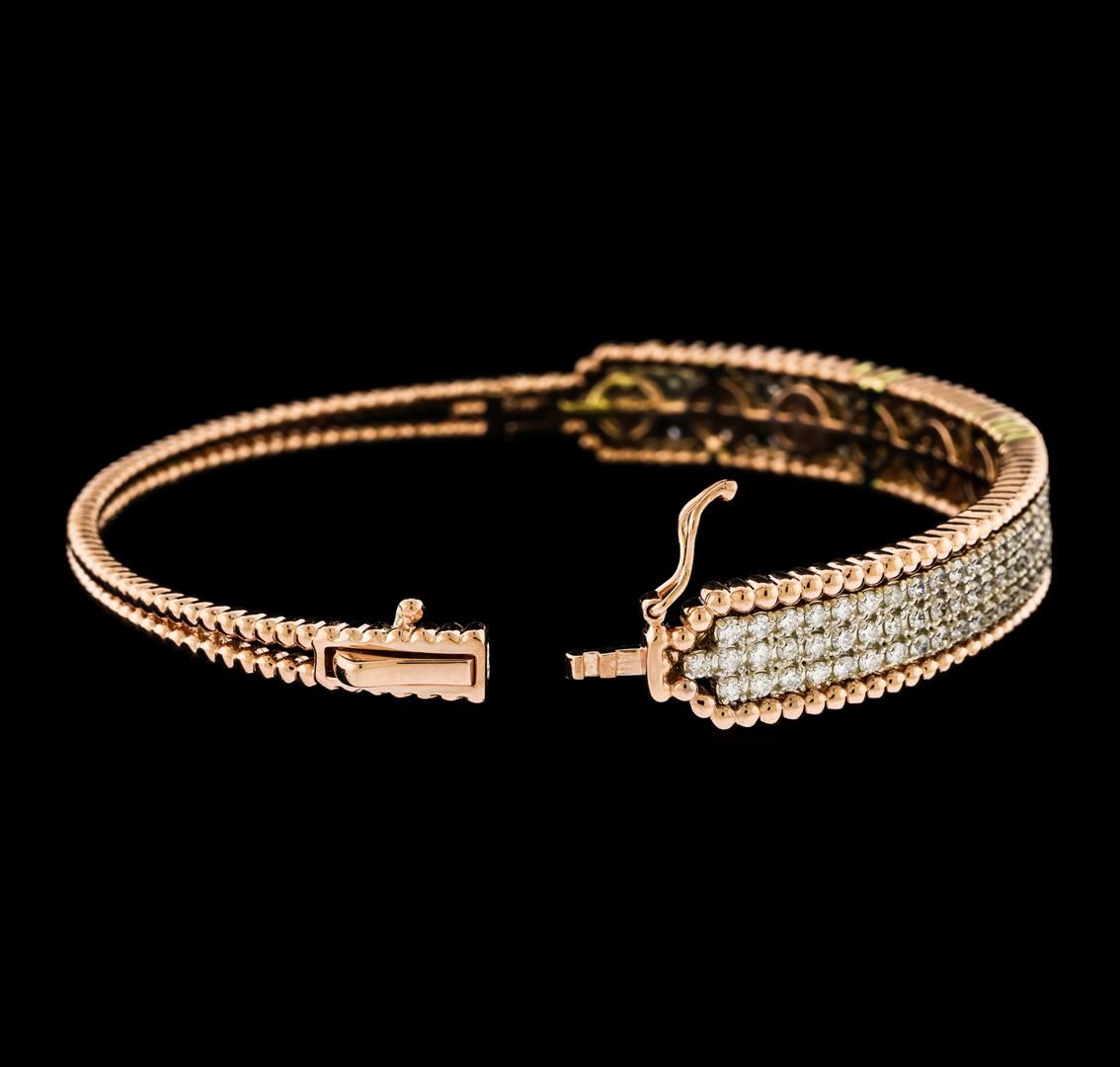 One electronically tested 14KT rose and white gold lady's combination cast & assembled fashion three row bangle bracelet with a tongue clasp with foldover safety with a bright polish finish. The featured lady's bracelet has a straight line connected bead motif and measures approximately 7 inches in length. Identified with markings of 'K14'. Condition is new, good workmanship. Containing: One Hundred Thirty-Seven prong set round brilliant cut diamonds, measuring 1.55 - 1.50 x 0.95mm (depth est.) approximate total weight of 137 Stones = 1.85ct. Graded in the setting. Clarity SI-1 to I-1. Color: G - I Cut Good. Total Weight of Diamonds 1.85ct.. Total Weight of Three Row Bangle Bracelet 22.70gm. GAS Appraised at $8,705.00.