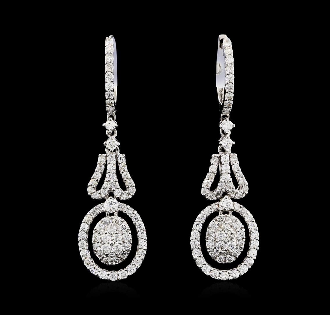 One pair electronically tested 18KT white gold lady's combination cast & assembled fashion dangle earrings with hinged clip backs with a bright polish finish. The featured lady's earrings have a dangle measuring 40 millimeters in length. Identified with markings of '18K'. Condition is new, good workmanship. Containing: Six prong set round brilliant cut diamonds, measuring 2.10 - 1.90 x 1.24mm (depth est.) approximate total weight of 6 Stones = 0.18ct. Graded in the setting. Color G - H Clarity VS-2 to SI-1 Cut Good One Hundred Thirty-Six prong set round brilliant cut diamonds, measuring 1.60 - 1.40 x 0.90mm (depth est.) approximate total weight of 136 Stones = 1.67ct. Graded in the setting. Color G - H Clarity SI-1 to I-1 Cut Good. Total Weight of Diamonds 1.85ct.. Total Weight of Earrings 5.70gm GAS Appraised at $6570.00. GAS Appraised at $6,570.00.