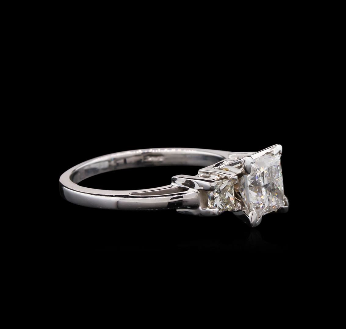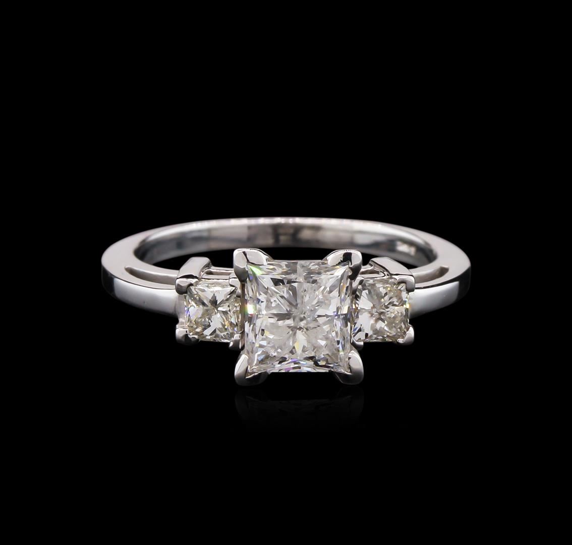 One electronically tested 14KT white gold lady's combination cast & assembled 3-stone ring with a bright polish finish. The featured lady's ring has a shank measuring 1.96 millimeters wide. Identified with markings of "14K". Condition is new, good workmanship. Containing: One prong set princess cut diamond, measuring 6.18 x 5.83 x 4.65mm (depth est.) approximate weight of 1.40ct. Graded in the setting. Clarity: I-1. Color: F - Very Good Two prong set princess cut diamonds, measuring 3.50 x 3.30 x 2.41mm (depth est.) approximate total weight of 2 Stones = 0.45ct. Graded in the setting. Clarity: I-1. Color: H - I. Cut Good. Total Weight of Diamonds 1.85ct. Total Weight of Ring 4.30gm. GAS Appraised at $13,415.00.