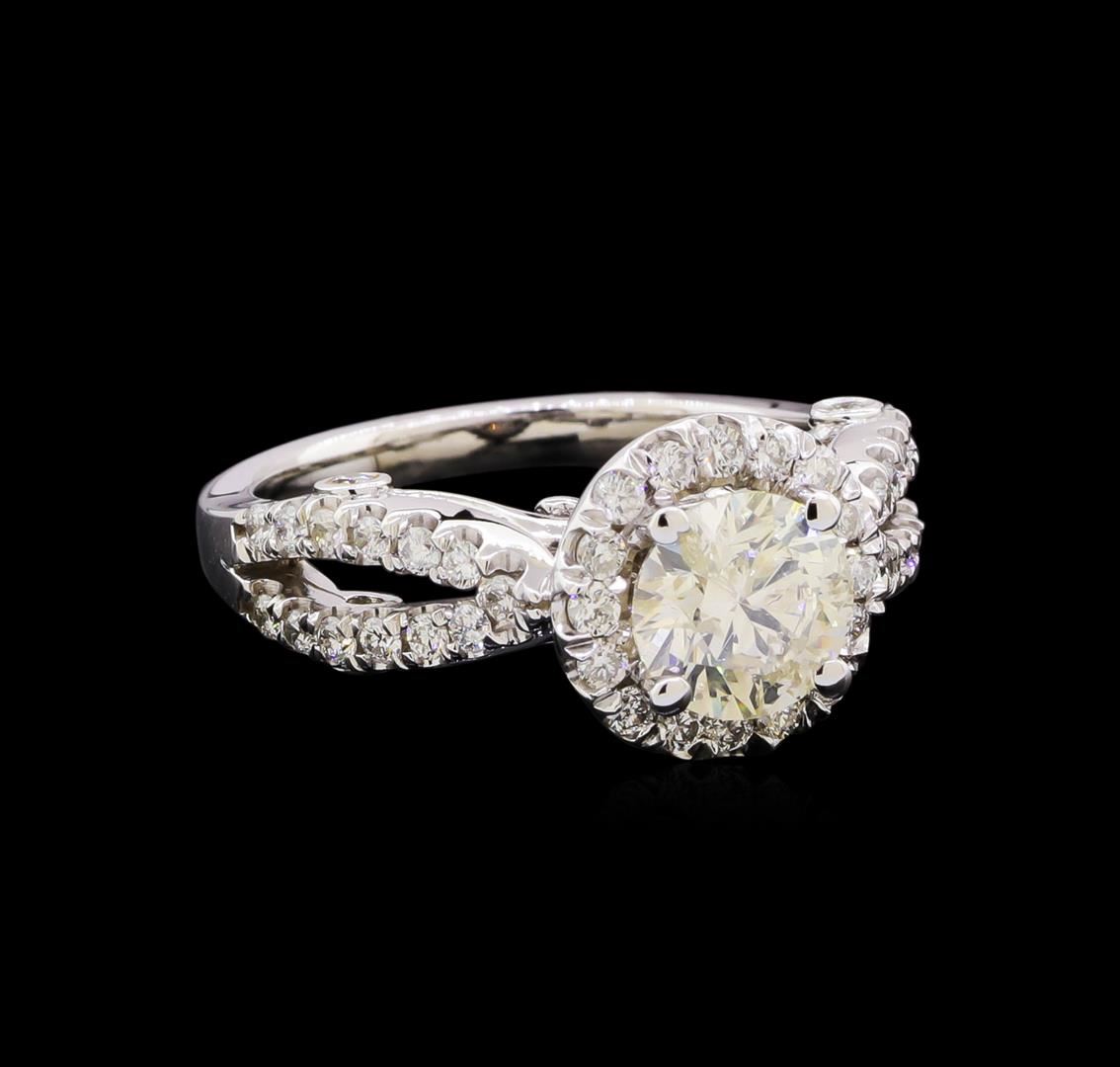 One electronically tested 14KT white gold lady's cast split shank wedding ring with a cathedral halo with a bright polish finish. Featured lady's ring has a shank measuring 2.07 millimeters in width. Identified with markings of "14K". Condition is new, good workmanship. Containing: One prong set round brilliant cut diamond, measuring 6.73 - 6.71 x 4.15mm (depth est.) approximate weight of 1.18ct. Graded in the setting. Clarity: I-1. Color: Very Good Two bezel set round brilliant cut diamonds, measuring 1.90 - 1.80 x 1.11mm (depth est.) approximate total weight of 2 Stones = 0.05ct. Graded in the setting. Clarity: SI-1 to SI-2. Color: G - Very Good Sixteen prong set round brilliant cut diamonds, measuring 1.70 - 1.60 x 0.99mm (depth est.) approximate total weight of 16 Stones = 0.25ct. Graded in the setting. Clarity: SI-1 to SI-2. Color: G - Good Thirty prong set round brilliant cut diamonds, measuring 1.50 - 1.45 x 0.93mm (depth est.) approximate total weight of 30 Stones = 0.37ct. Graded in the setting. Clarity: SI-1 to SI-2. Color: G - Good. Total Weight of Diamonds 1.85ct. Total Weight of Wedding Ring 5.50gm. GAS Appraised at $12,015.00.
