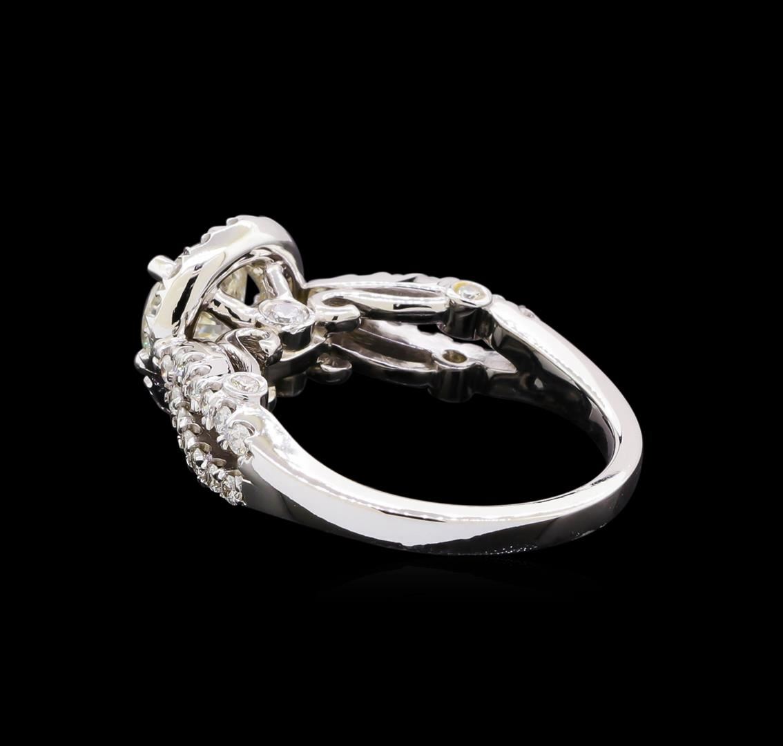 One electronically tested 14KT white gold lady's cast split shank wedding ring with a cathedral halo with a bright polish finish. Featured lady's ring has a shank measuring 2.07 millimeters in width. Identified with markings of "14K". Condition is new, good workmanship. Containing: One prong set round brilliant cut diamond, measuring 6.73 - 6.71 x 4.15mm (depth est.) approximate weight of 1.18ct. Graded in the setting. Clarity: I-1. Color: Very Good Two bezel set round brilliant cut diamonds, measuring 1.90 - 1.80 x 1.11mm (depth est.) approximate total weight of 2 Stones = 0.05ct. Graded in the setting. Clarity: SI-1 to SI-2. Color: G - Very Good Sixteen prong set round brilliant cut diamonds, measuring 1.70 - 1.60 x 0.99mm (depth est.) approximate total weight of 16 Stones = 0.25ct. Graded in the setting. Clarity: SI-1 to SI-2. Color: G - Good Thirty prong set round brilliant cut diamonds, measuring 1.50 - 1.45 x 0.93mm (depth est.) approximate total weight of 30 Stones = 0.37ct. Graded in the setting. Clarity: SI-1 to SI-2. Color: G - Good. Total Weight of Diamonds 1.85ct. Total Weight of Wedding Ring 5.50gm. GAS Appraised.