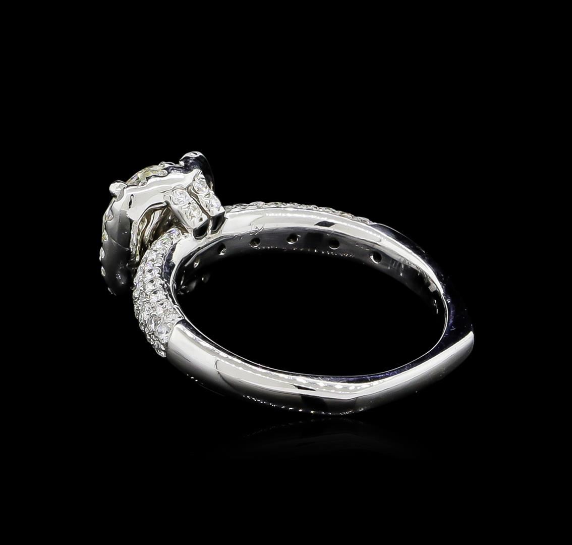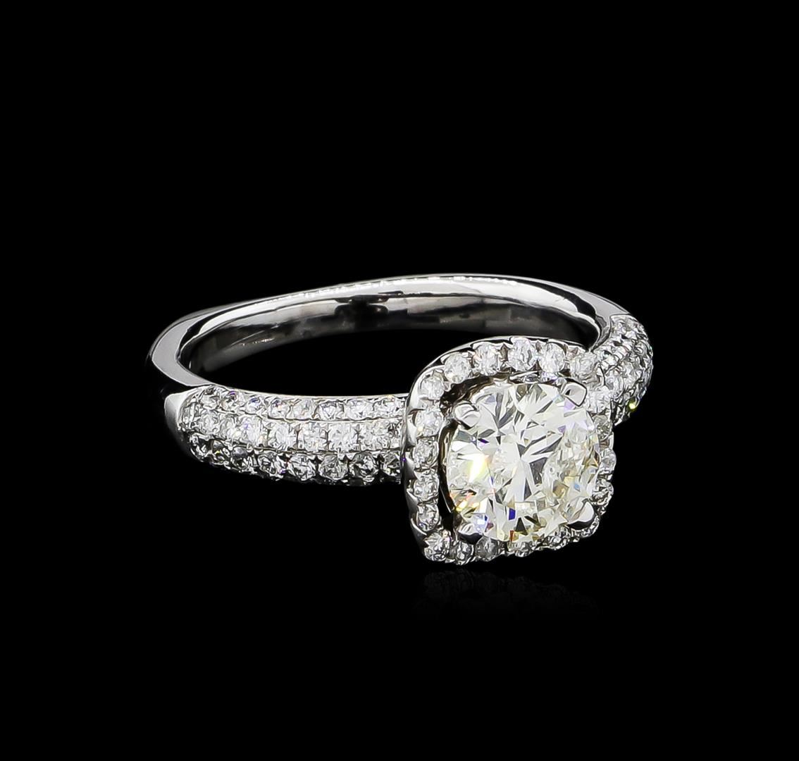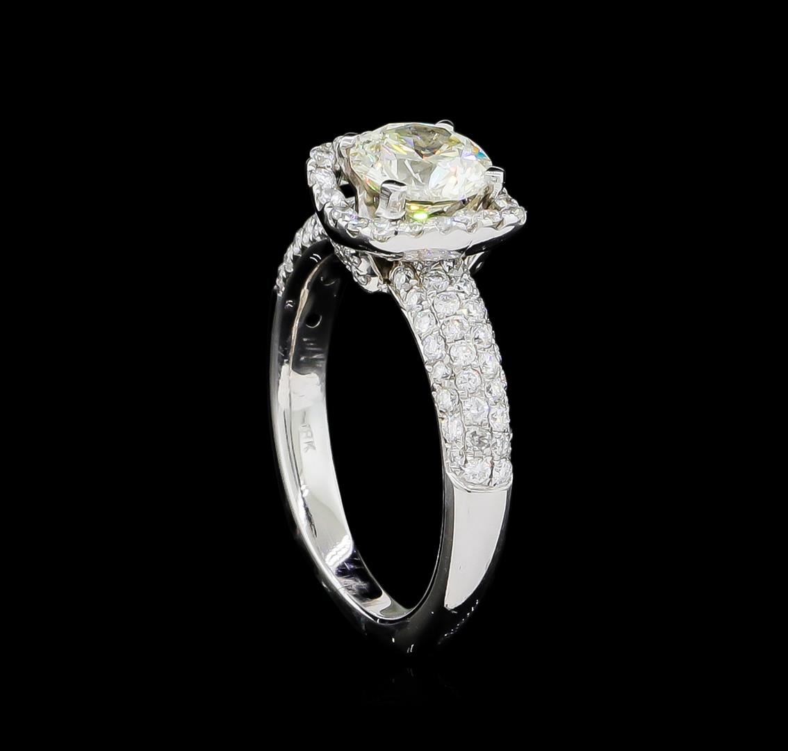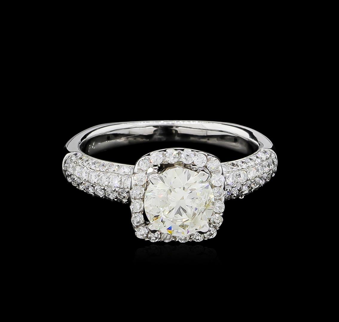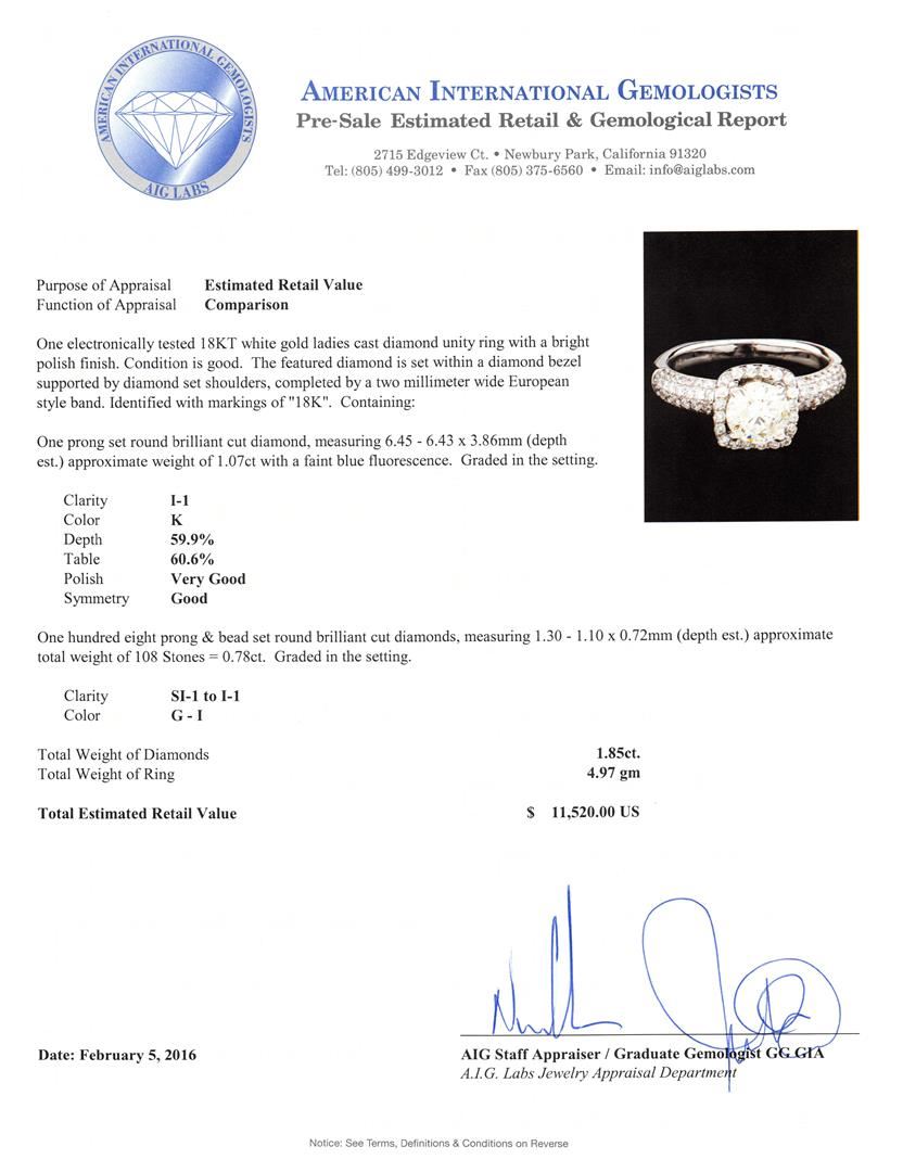 One electronically tested 18KT white gold ladies cast diamond unity ring with a bright polish finish. The featured diamond is set within a diamond bezel supported by diamond set shoulders, completed by a two millimeter wide European style band. Identified with markings of "18K". Condition is good. Containing: One prong set round brilliant cut diamond, measuring 6.45 - 6.43 x 3.86mm (depth est.) approximate weight of 1.07ct with a faint blue fluorescence. Graded in the setting. Clarity: I-1. Color: 59.9%. Table 60.6%. One Hundred Eight prong & bead set round brilliant cut diamonds, measuring 1.30 - 1.10 x 0.72mm (depth est.) approximate total weight of 108 Stones = 0.78ct. Graded in the setting. Clarity: SI-1 to I-1. Color: G - I. Total Weight of Diamonds 1.85ct. Total Weight of Ring 4.97gm. AIG Appraised at $11,520.00.