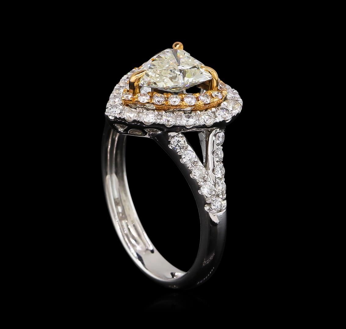 One electronically tested 18KT white gold ladies cast diamond ring. The featured diamond is set within tiered diamond bezels supported by diamond set split shoulders, completed by a three millimeter wide band. Bright polish finish with rose gold accents. Trademark is MICHA. Identified with markings of "18K 750". Condition is new, good workmanship. Containing: One prong set heart shaped cut diamond, measuring 7.60 x 7.10 x 3.70mm (depth est.), 5.00.%. GTCF approximate weight of 1.24ct with a faint blue fluorescence. Very Faint secondary brown color. Graded in the setting. Clarity: SI-1. Color: 52.1%. Table 57.8%. Thirty-Eight prong set round brilliant cut diamonds, measuring 1.70 - 1.40 x 0.93mm (depth est.) approximate total weight of 38 Stones = 0.50ct. Graded in the setting. Clarity: SI-1 to I-1. Color: F - G Nineteen prong set round brilliant cut diamonds, measuring 1.30 - 1.00 x 0.69mm (depth est.) approximate total weight of 19 Stones = 0.11ct. Graded in the setting. Clarity: SI-1 to SI-2. Color: F - G. Total Weight of Diamonds 1.85ct. Total Weight of Ring 4.83gm. AIG Appraised at $15,790.00.