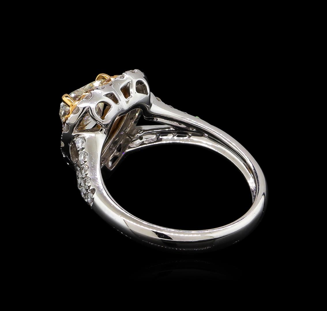 One electronically tested 18KT white gold ladies cast diamond ring. The featured diamond is set within tiered diamond bezels supported by diamond set split shoulders, completed by a three millimeter wide band. Bright polish finish with rose gold accents. Trademark is MICHA. Identified with markings of "18K 750". Condition is new, good workmanship. Containing: One prong set heart shaped cut diamond, measuring 7.60 x 7.10 x 3.70mm (depth est.), 5.00.%. GTCF approximate weight of 1.24ct with a faint blue fluorescence. Very Faint secondary brown color. Graded in the setting. Clarity: SI-1. Color: 52.1%. Table 57.8%. Thirty-Eight prong set round brilliant cut diamonds, measuring 1.70 - 1.40 x 0.93mm (depth est.) approximate total weight of 38 Stones = 0.50ct. Graded in the setting. Clarity: SI-1 to I-1. Color: F - G Nineteen prong set round brilliant cut diamonds, measuring 1.30 - 1.00 x 0.69mm (depth est.) approximate total weight of 19 Stones = 0.11ct. Graded in the setting. Clarity: SI-1 to SI-2. Color: F - G. Total Weight of Diamonds 1.85ct. Total Weight of Ring 4.83gm. AIG Appraised at $15,790.00.