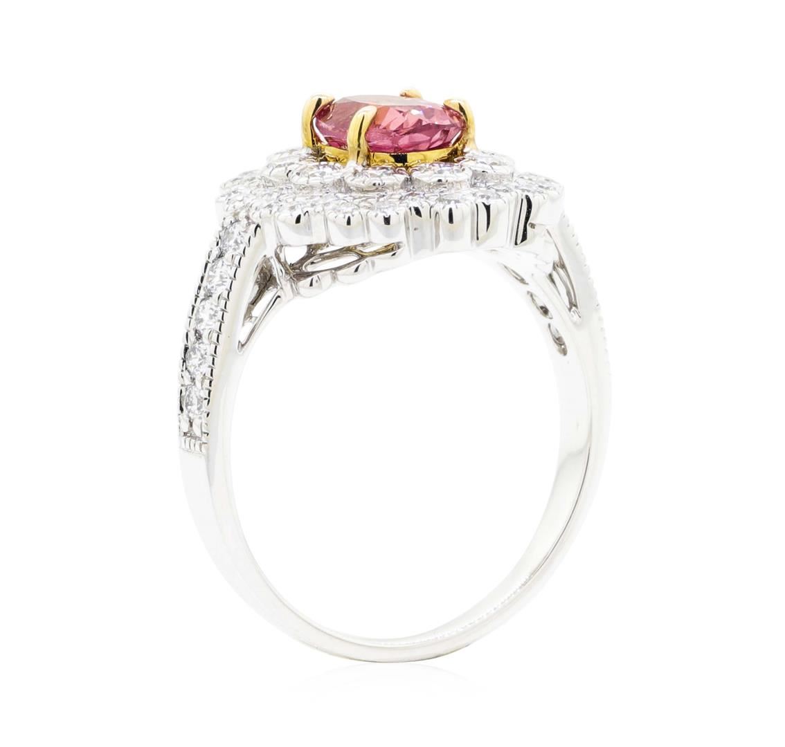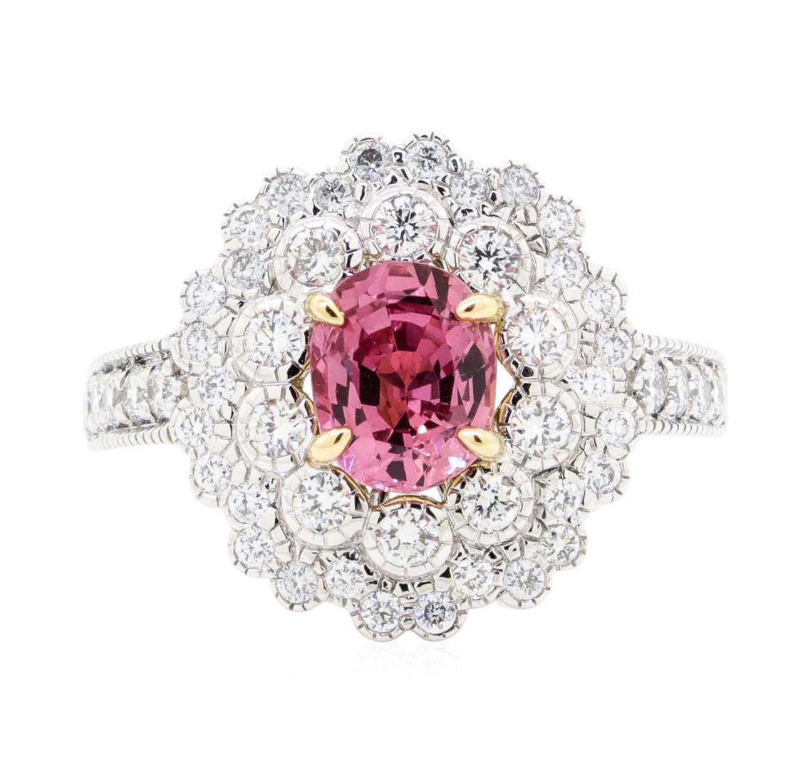 One electronically tested 18KT white and rose gold lady's combination cast & assembled fashion ring with a double scalloped halo with a bright polish with milgrain detailing finish. The featured lady's ring has a shank measuring 1.88 millimeters wide. Identified with markings of '18K'. Condition is new, good workmanship. Containing: One prong set oval modified mixed cut natural pink sapphire, measuring 6.80 x 5.48 x 3.70mm, (depth est.) approximate weight of 1.20ct., clarity is eye clean, medium, very slightly brownish, slightly purplish red color, (GIA slpR 5/3), cut is good. Transmitting light with no distortion, transparent. Colored gemstones are presumed to have been subjected to commonly used enhancement processes. Graded in the setting. Ten bezel set round brilliant cut diamonds, measuring 1.70 - 1.65 x 1.04mm (depth est.) approximate total weight of 10 Stones = 0.18ct. Graded in the setting. Color G - H Clarity VS-2 to SI-1 Cut Very Good Ten prong set round brilliant cut diamonds, measuring 1.80 - 1.75 x 1.10mm (depth est.) approximate total weight of 10 Stones = 0.22ct. Graded in the setting. Color G - H Clarity VS-2 to SI-1 Cut Very Good Thirty prong set round brilliant cut diamonds, measuring 1.35 - 1.30 x 0.80mm (depth est.) approximate total weight of 30 Stones = 0.25ct. Graded in the setting. Color G - H Clarity VS-2 to SI-1 Cut Very Good. Total Weight of Colored Stones 1.20ct.. Total Weight of Diamonds 0.65ct.. Total Weight of Ring 5.40gm GAS Appraised at $7130.00. GAS Appraised.