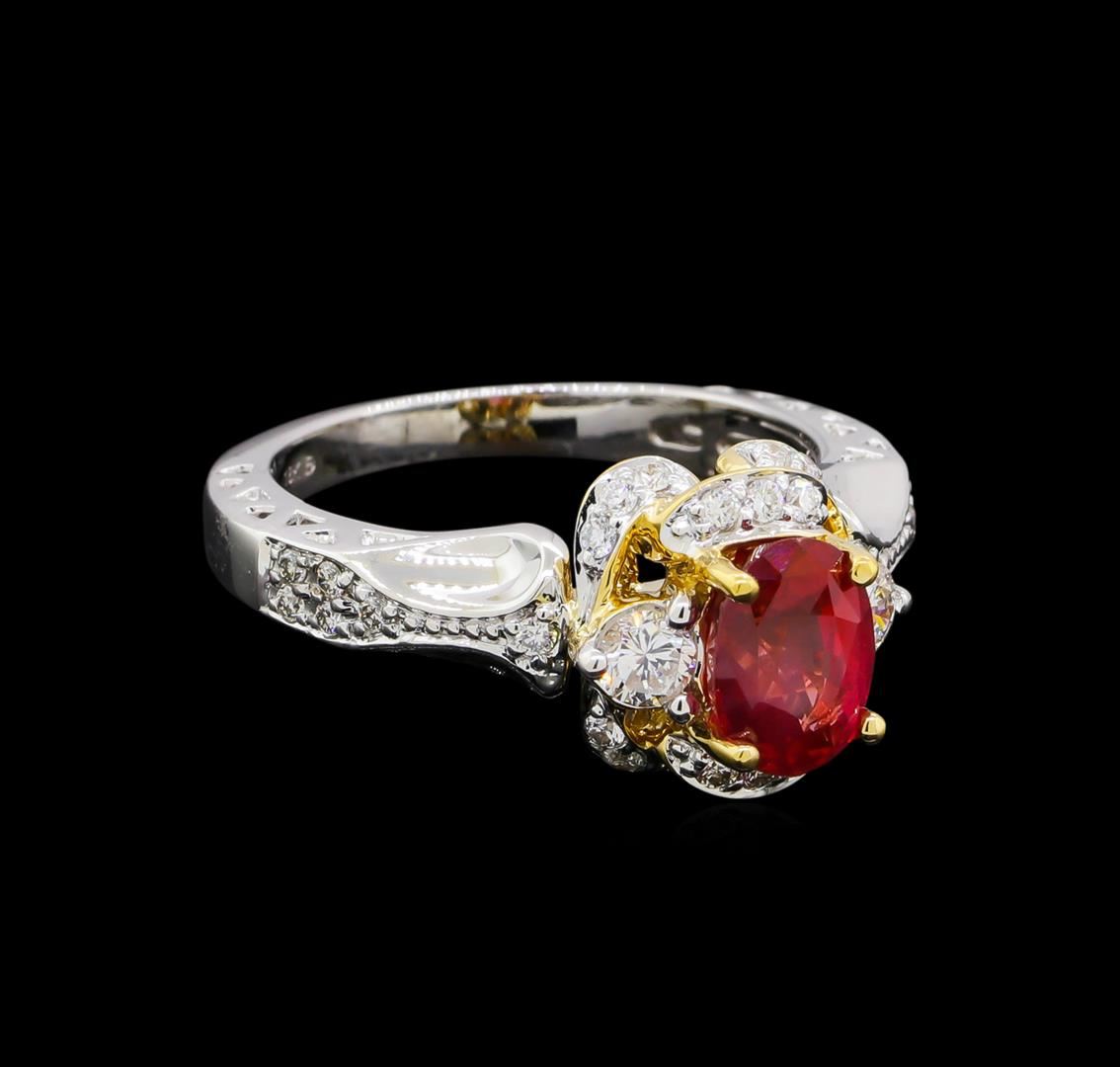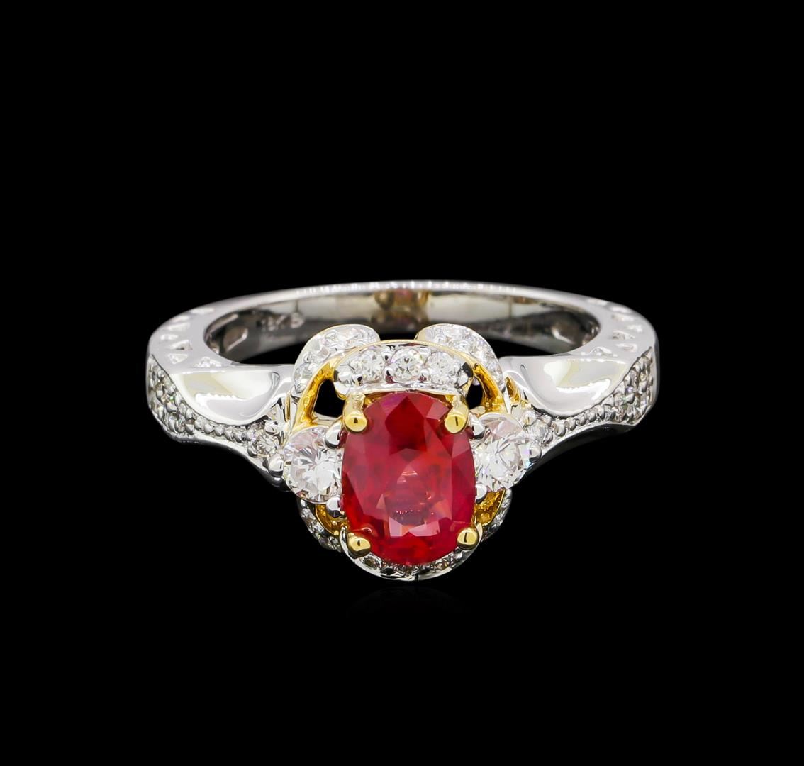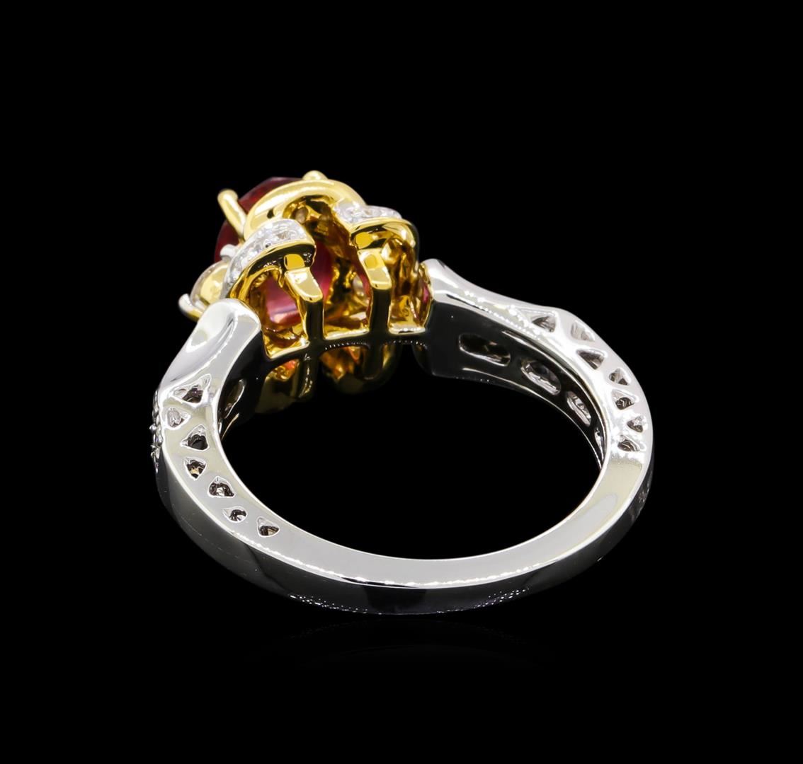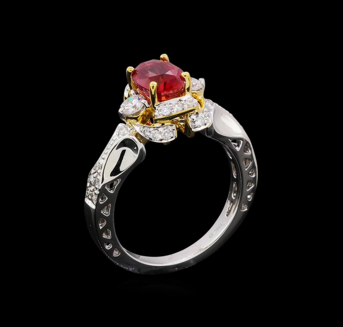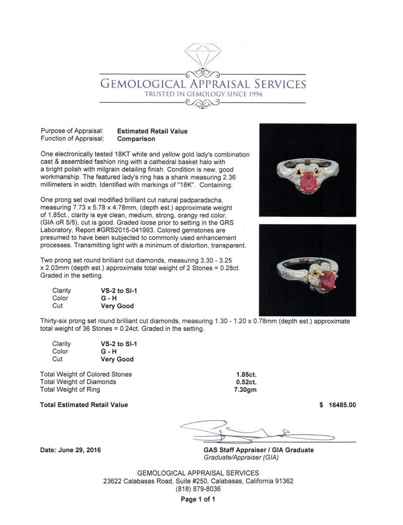 One electronically tested 18KT white and yellow gold lady's combination cast & assembled fashion ring with a cathedral basket halo with a bright polish with milgrain detailing finish. The featured lady's ring has a shank measuring 2.36 millimeters in width. Identified with markings of "18K". Condition is new, good workmanship. Containing: One prong set oval modified brilliant cut natural padparadscha, measuring 7.73 x 5.78 x 4.78mm, (depth est.) approximate weight of 1.85ct., clarity is eye clean, medium, strong, orangy red color, (GIA oR 5/5), cut is good. Graded loose prior to setting in the GRS Laboratory, Report #GRS2015-041993. Colored gemstones are presumed to have been subjected to commonly used enhancement processes. Transmitting light with a minimum of distortion, transparent. Two prong set round brilliant cut diamonds, measuring 3.30 - 3.25 x 2.03mm (depth est.) approximate total weight of 2 Stones = 0.28ct. Graded in the setting. Clarity: VS-2 to SI-1. Color: G - Very Good Thirty-Six prong set round brilliant cut diamonds, measuring 1.30 - 1.20 x 0.78mm (depth est.) approximate total weight of 36 Stones = 0.24ct. Graded in the setting. Clarity: VS-2 to SI-1. Color: G - Very Good. Total Weight of Colored Stones 1.85ct. Total Weight of Diamonds 0.52ct. Total Weight of Ring 7.30gm. GAS Appraised at $16,485.00.
