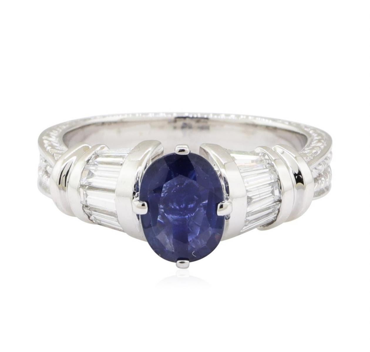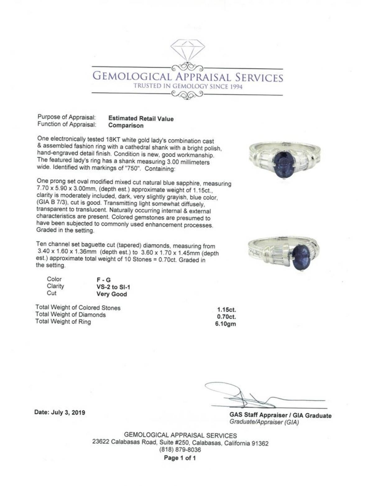 One electronically tested 18KT white gold lady's combination cast & assembled fashion ring with a cathedral shank with a bright polish, hand-engraved detail finish. The featured lady's ring has a shank measuring 3.00 millimeters wide. Identified with markings of '750'. Condition is new, good workmanship. Containing: One prong set oval modified mixed cut natural blue sapphire, measuring 7.70 x 5.90 x 3.00mm, (depth est.) approximate weight of 1.15ct., clarity is moderately included, dark, very slightly grayish, blue color, (GIA B 7/3), cut is good. Transmitting light somewhat diffusely, transparent to translucent. Naturally occurring internal & external characteristics are present. Colored gemstones are presumed to have been subjected to commonly used enhancement processes. Graded in the setting. Ten channel set baguette cut (tapered) diamonds, measuring from 3.40 x 1.60 x 1.36mm (depth est.) to 3.60 x 1.70 x 1.45mm (depth est.) approximate total weight of 10 Stones = 0.70 ct. Graded in the setting. Color F - G Clarity VS-2 to SI-1 Cut Very Good. Total Weight of Colored Stones 1.15ct.. Total Weight of Diamonds 0.70 ct.. Total Weight of Ring 6.10gm GAS Appraised at $4335.00. GAS Appraised.