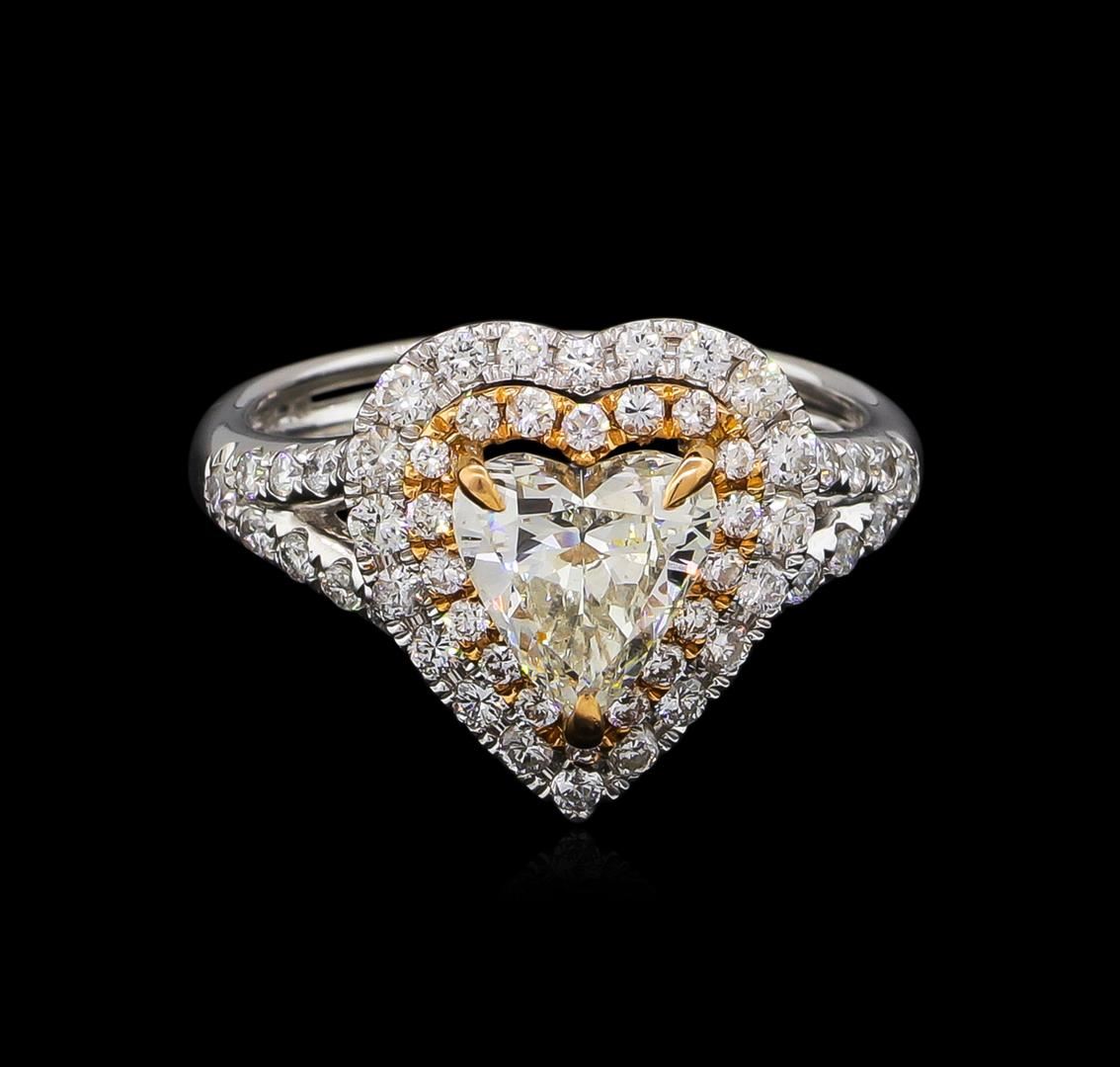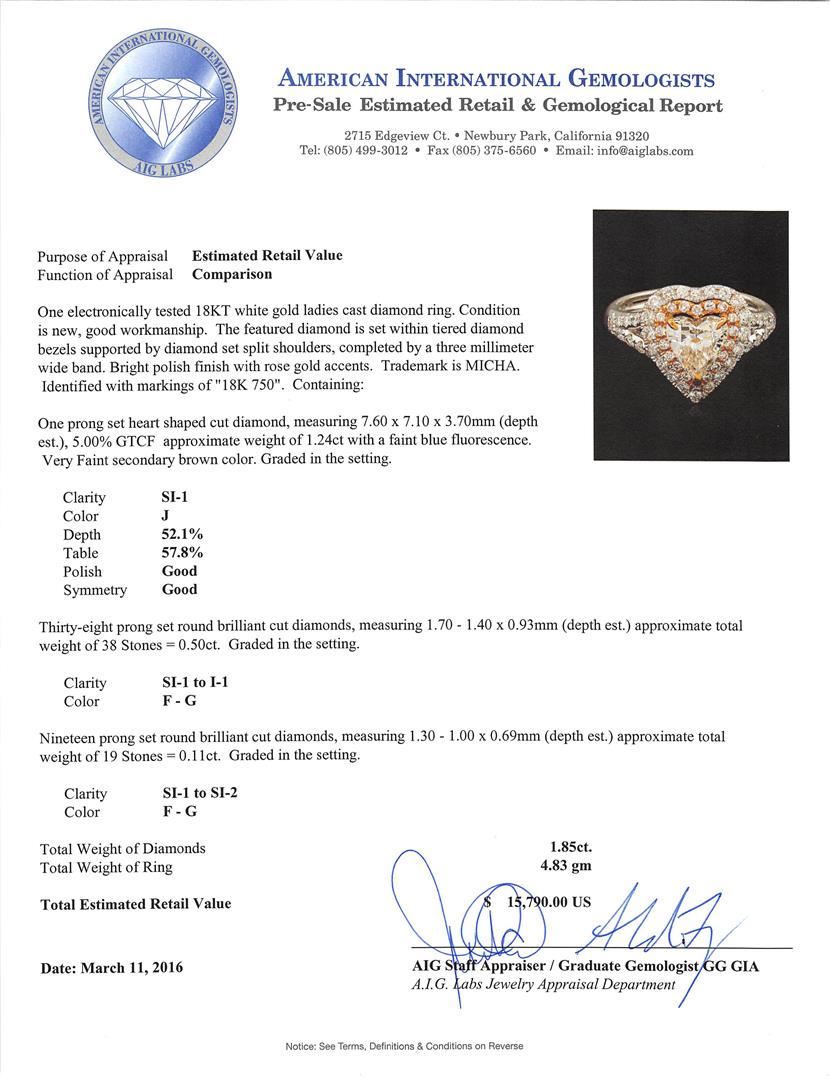 One electronically tested 18KT white gold ladies cast diamond ring. The featured diamond is set within tiered diamond bezels supported by diamond set split shoulders, completed by a three millimeter wide band. Bright polish finish with rose gold accents. Trademark is MICHA. Identified with markings of "18K 750". Condition is new, good workmanship. Containing: One prong set heart shaped cut diamond, measuring 7.60 x 7.10 x 3.70mm (depth est.), 5.00.%. GTCF approximate weight of 1.24ct with a faint blue fluorescence. Very Faint secondary brown color. Graded in the setting. Clarity: SI-1. Color: 52.1%. Table 57.8%. Thirty-Eight prong set round brilliant cut diamonds, measuring 1.70 - 1.40 x 0.93mm (depth est.) approximate total weight of 38 Stones = 0.50ct. Graded in the setting. Clarity: SI-1 to I-1. Color: F - G Nineteen prong set round brilliant cut diamonds, measuring 1.30 - 1.00 x 0.69mm (depth est.) approximate total weight of 19 Stones = 0.11ct. Graded in the setting. Clarity: SI-1 to SI-2. Color: F - G. Total Weight of Diamonds 1.85ct. Total Weight of Ring 4.83gm. AIG Appraised at $15,790.00.
