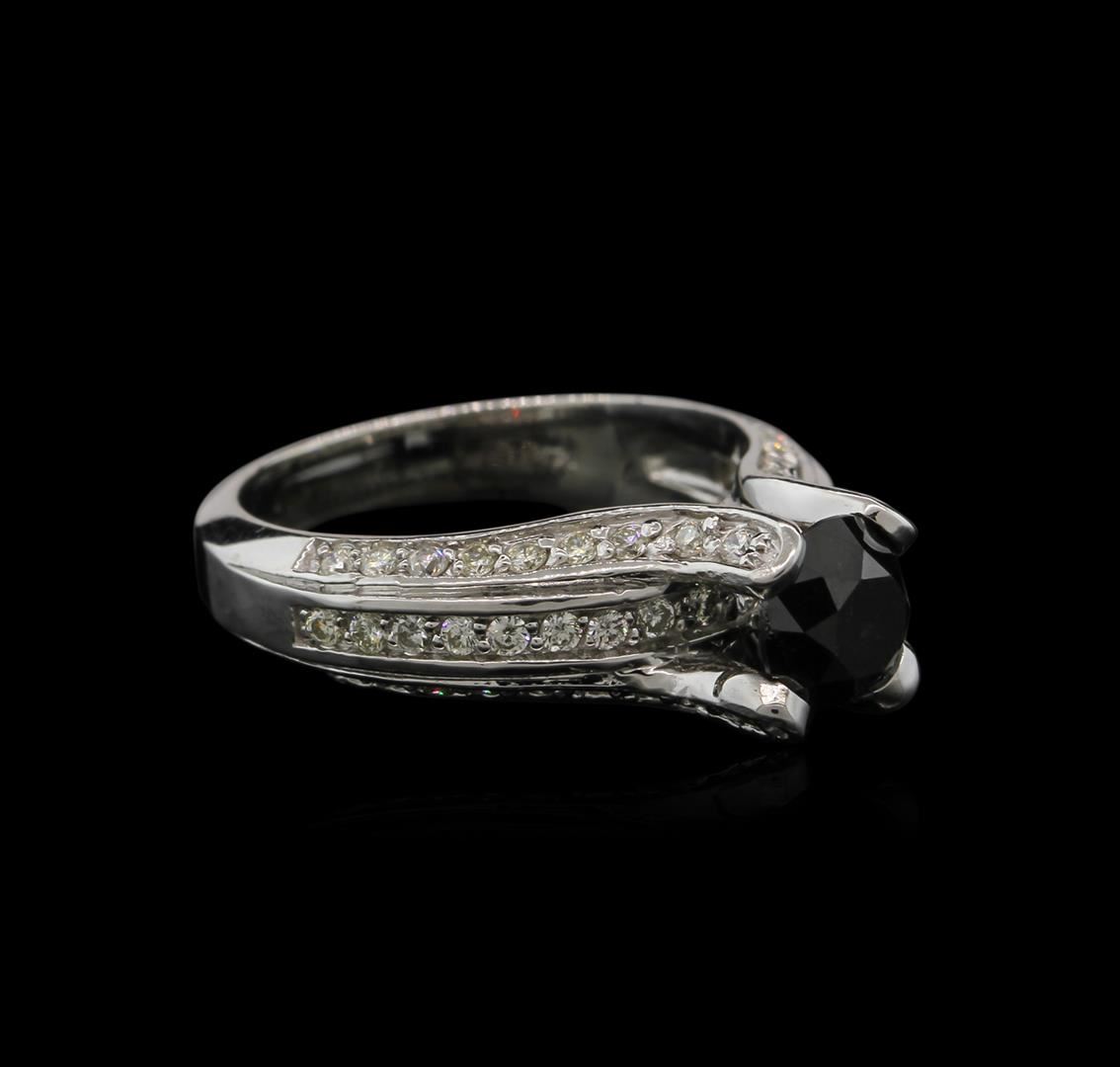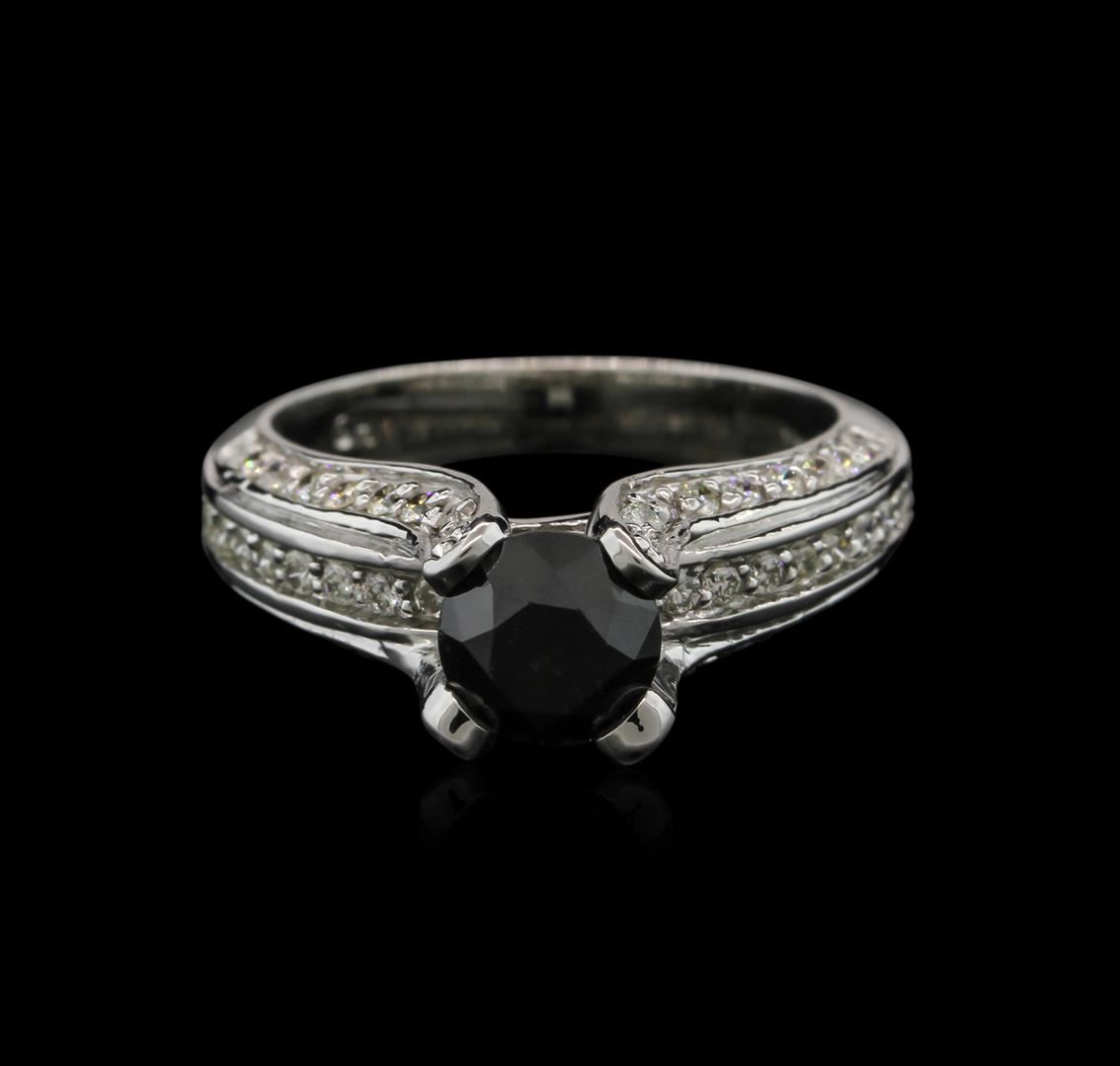 One ring featuring: 14KT white gold weighing 6.15 grams containing one prong set round black diamond center stone with a total weight of 1.36ct and pave set round white diamonds with a total weight of 0.50ct.