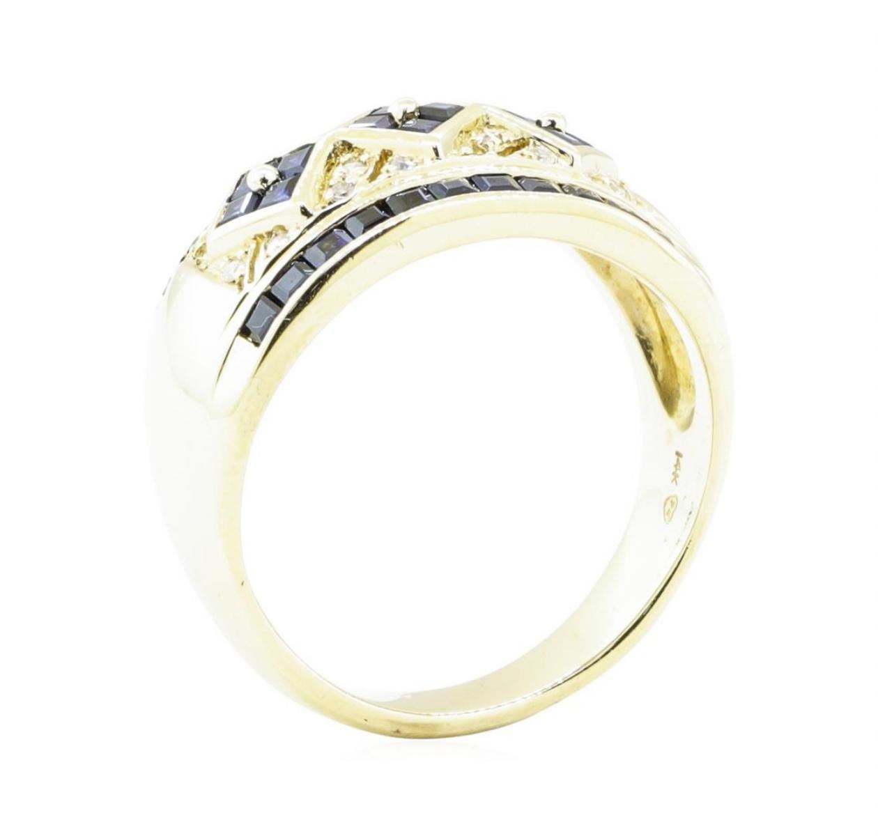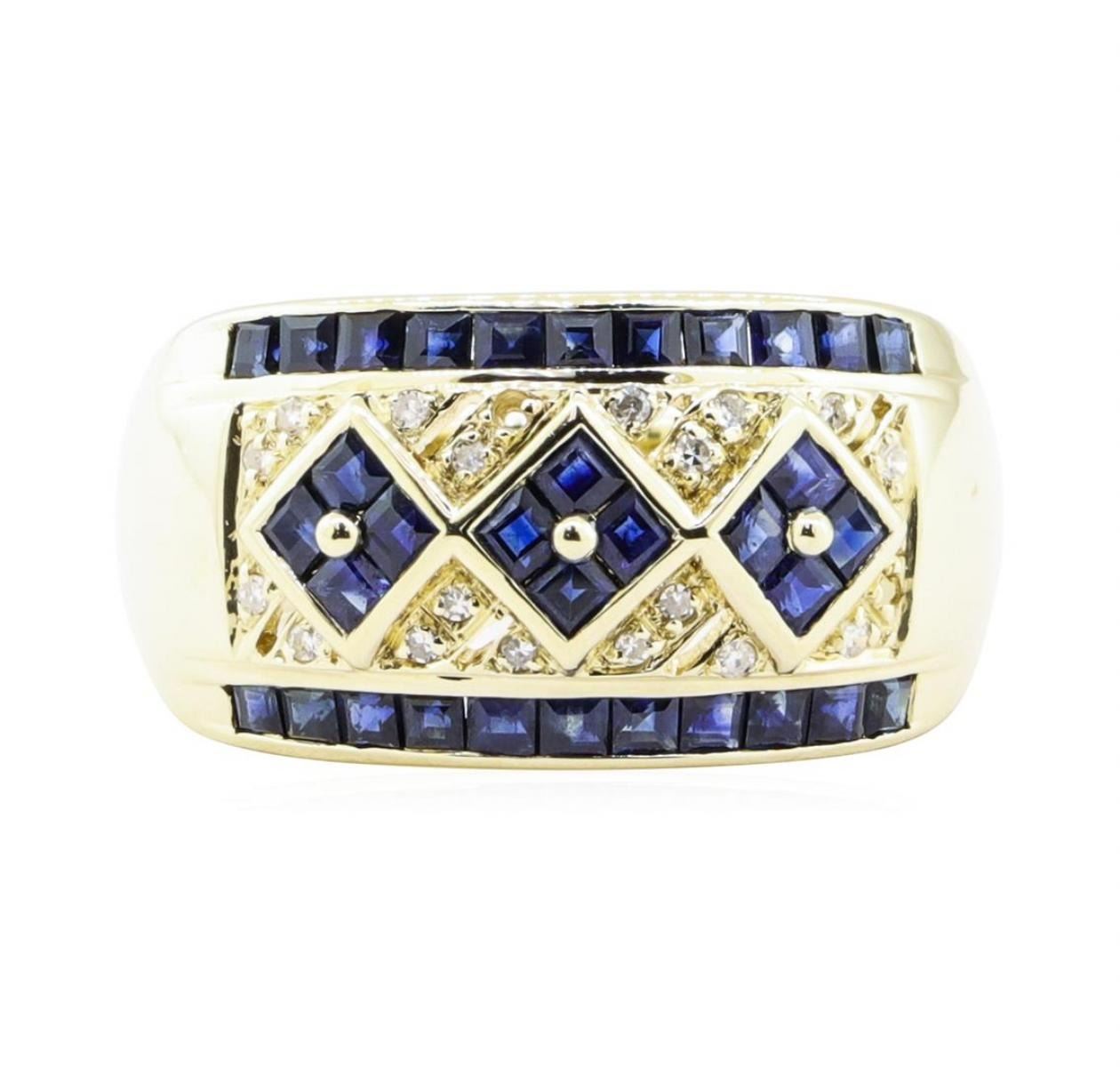 One electronically tested 14KT yellow gold lady's combination cast & assembled fashion wide band with a tapered shank with a bright polish finish. The featured lady's ring has a shank measuring 4.90 millimeters in width. Identified with markings of '14K'. Condition is Good. Containing: Thirty-four channel set square standard step cut natural blue sapphires, measuring 2.00 x 1.90 x 1.27mm, (depth est.) approximate total weight of 1.70 ct., clarity is eye clean, medium dark, moderately strong, blue color, (GIA B 6/4), cut is good. Colored gemstones are presumed to have been subjected to commonly used enhancement processes. Transmitting light with no distortion, transparent. Graded in the setting. Twenty prong set single cut diamonds, measuring 1.30 - 1.25 x 0.77mm (depth est.) approximate total weight of 20 Stones = 0.16ct. Graded in the setting. Color G - H Clarity VS-2 to SI-1 Cut Good. Total Weight of Colored Stones 1.70 ct.. Total Weight of Diamonds 0.16ct.. Total Weight of Wide Band 10.70gm GAS Appraised at $3610.00. GAS Appraised.