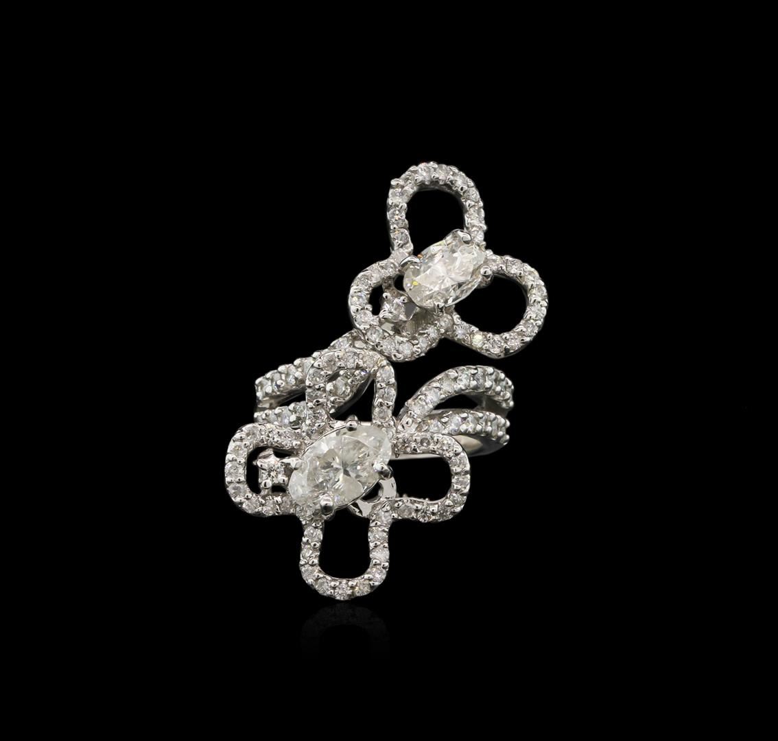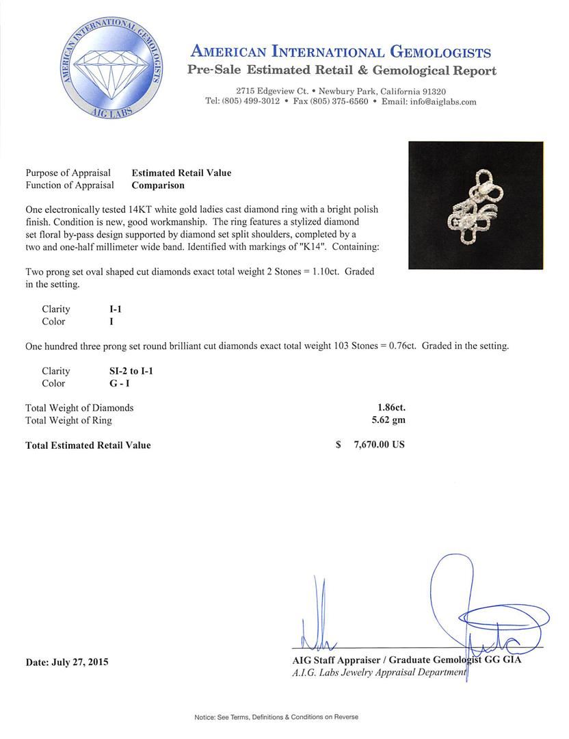 One electronically tested 14KT white gold ladies cast diamond ring with a bright polish finish. The ring features a stylized diamond set floral by-pass design supported by diamond set split shoulders, completed by a two and one-half millimeter wide band. Identified with markings of "K14". Condition is new, good workmanship. Containing: Two prong set oval shaped cut diamonds exact total weight 2 Stones = 1.10ct. Graded in the setting. Clarity: I-1. Color: I One Hundred Three prong set round brilliant cut diamonds exact total weight 103 Stones = 0.76ct. Graded in the setting. Clarity: SI-2 to I-1. Color: G - I. Total Weight of Diamonds 1.86ct. Total Weight of Ring 5.62gm. AIG Appraised at $7,670.00.