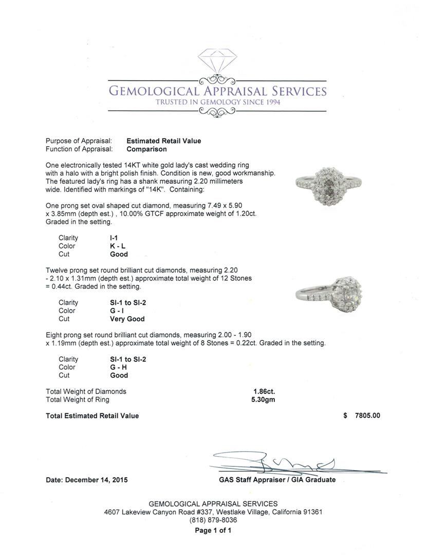 One electronically tested 14KT white gold lady's cast wedding ring with a halo with a bright polish finish. The featured lady's ring has a shank measuring 2.20 millimeters wide. Identified with markings of "14K". Condition is new, good workmanship. Containing: One prong set oval shaped cut diamond, measuring 7.49 x 5.90 x 3.85mm (depth est.) , 10.00.%. GTCF approximate weight of 1.20ct. Graded in the setting. Clarity: I-1. Color: K - Good Twelve prong set round brilliant cut diamonds, measuring 2.20 - 2.10 x 1.31mm (depth est.) approximate total weight of 12 Stones = 0.44ct. Graded in the setting. Clarity: SI-1 to SI-2. Color: G - I. Cut Very Good Eight prong set round brilliant cut diamonds, measuring 2.00 - 1.90 x 1.19mm (depth est.) approximate total weight of 8 Stones = 0.22ct. Graded in the setting. Clarity: SI-1 to SI-2. Color: G - Good. Total Weight of Diamonds 1.86ct. Total Weight of Ring 5.30gm. GAS Appraised at $7,805.00.