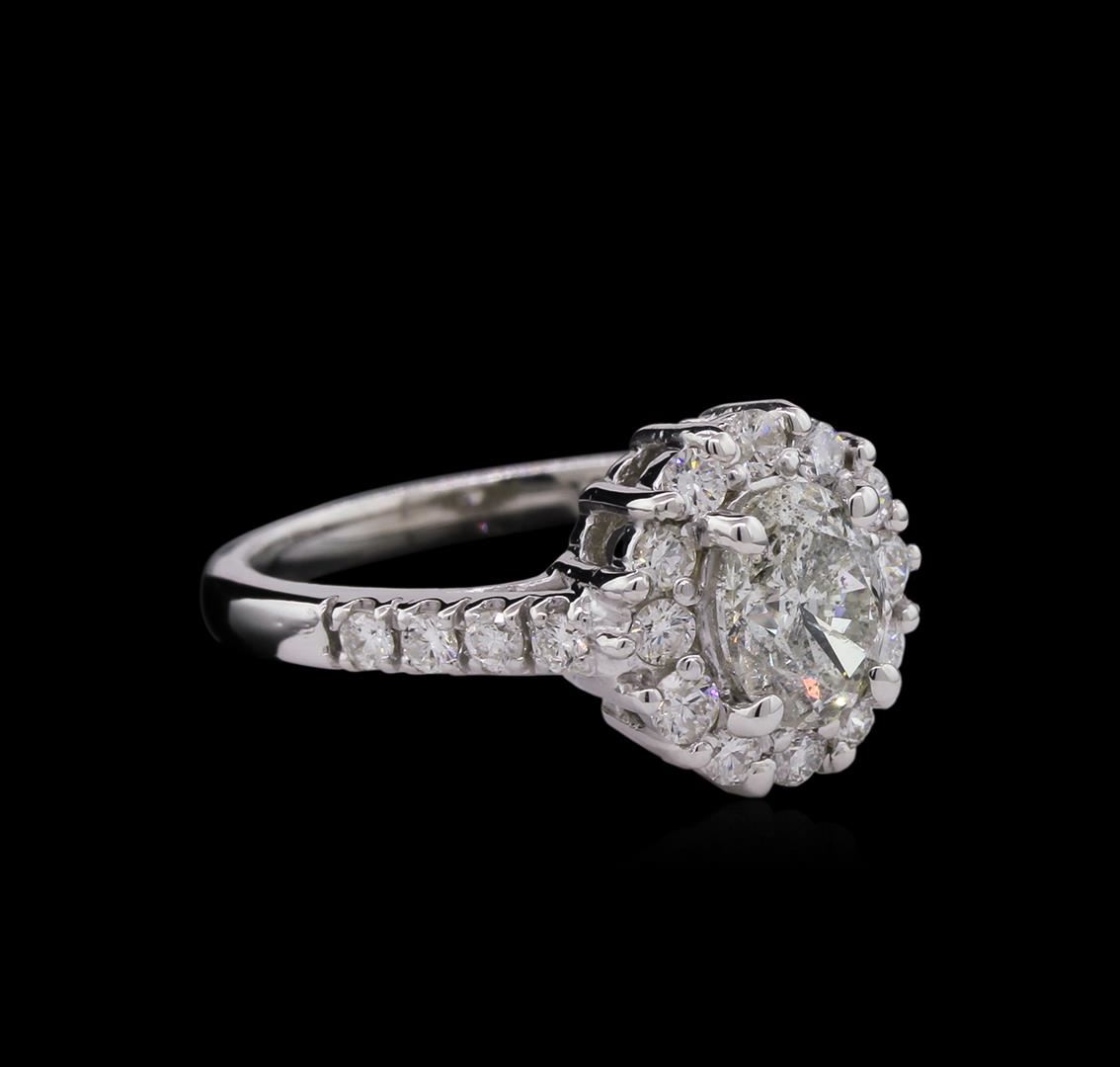 One electronically tested 14KT white gold lady's cast wedding ring with a halo with a bright polish finish. The featured lady's ring has a shank measuring 2.20 millimeters wide. Identified with markings of "14K". Condition is new, good workmanship. Containing: One prong set oval shaped cut diamond, measuring 7.49 x 5.90 x 3.85mm (depth est.) , 10.00.%. GTCF approximate weight of 1.20ct. Graded in the setting. Clarity: I-1. Color: K - Good Twelve prong set round brilliant cut diamonds, measuring 2.20 - 2.10 x 1.31mm (depth est.) approximate total weight of 12 Stones = 0.44ct. Graded in the setting. Clarity: SI-1 to SI-2. Color: G - I. Cut Very Good Eight prong set round brilliant cut diamonds, measuring 2.00 - 1.90 x 1.19mm (depth est.) approximate total weight of 8 Stones = 0.22ct. Graded in the setting. Clarity: SI-1 to SI-2. Color: G - Good. Total Weight of Diamonds 1.86ct. Total Weight of Ring 5.30gm. GAS Appraised at $7,805.00.