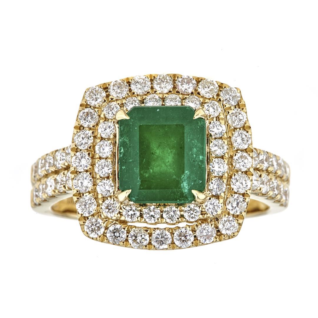 One Emerald and Diamond Ring featuring: 18KT Yellow Gold weighing a total of 5.80 grams, Emerald with a total weight of 1.86ct, and 64 Diamonds with a total weight of 1.06ctw.