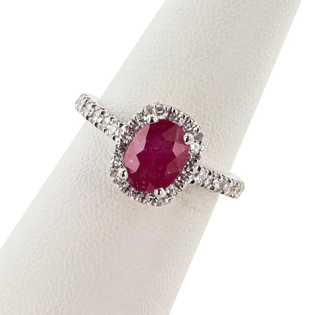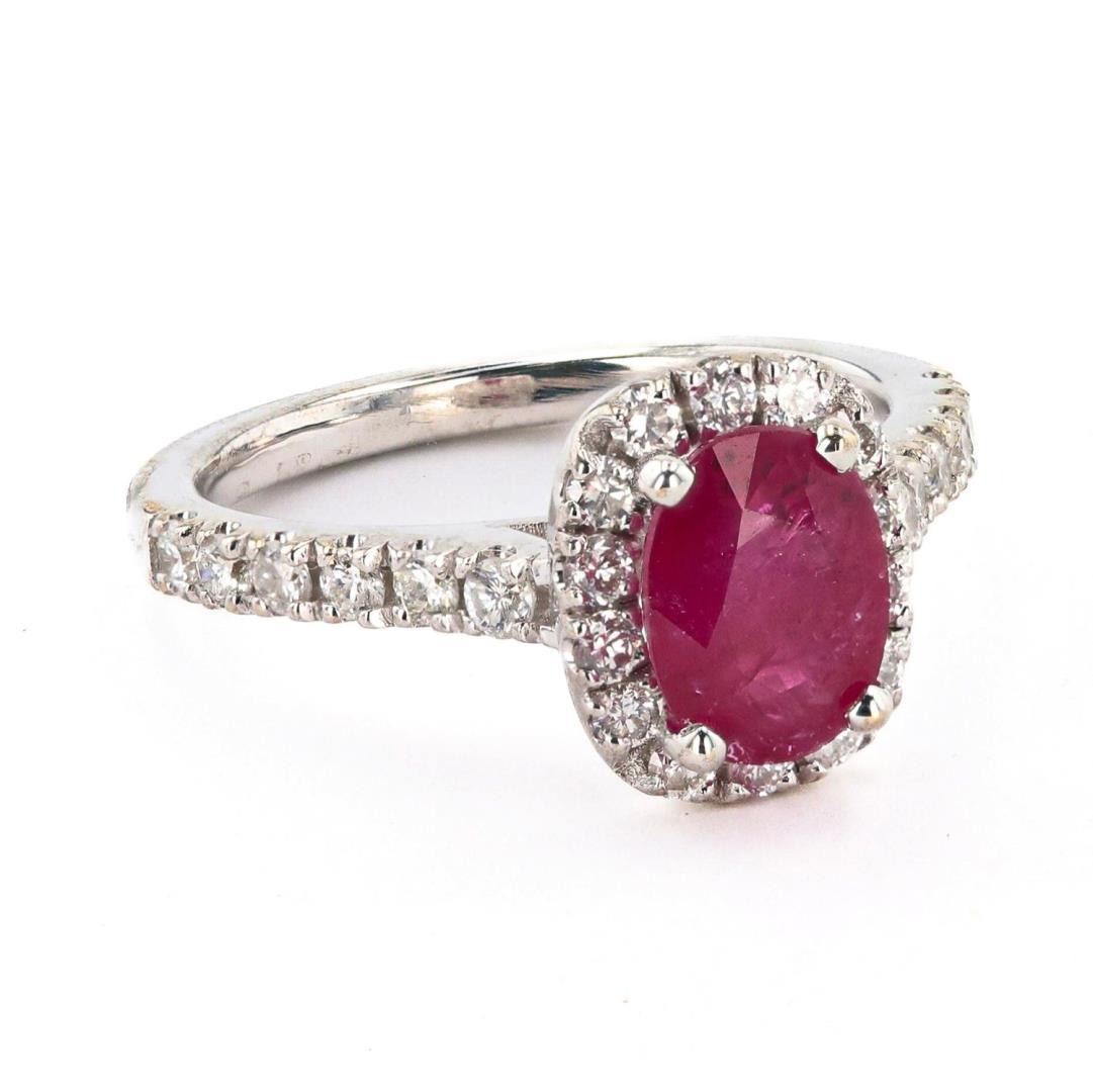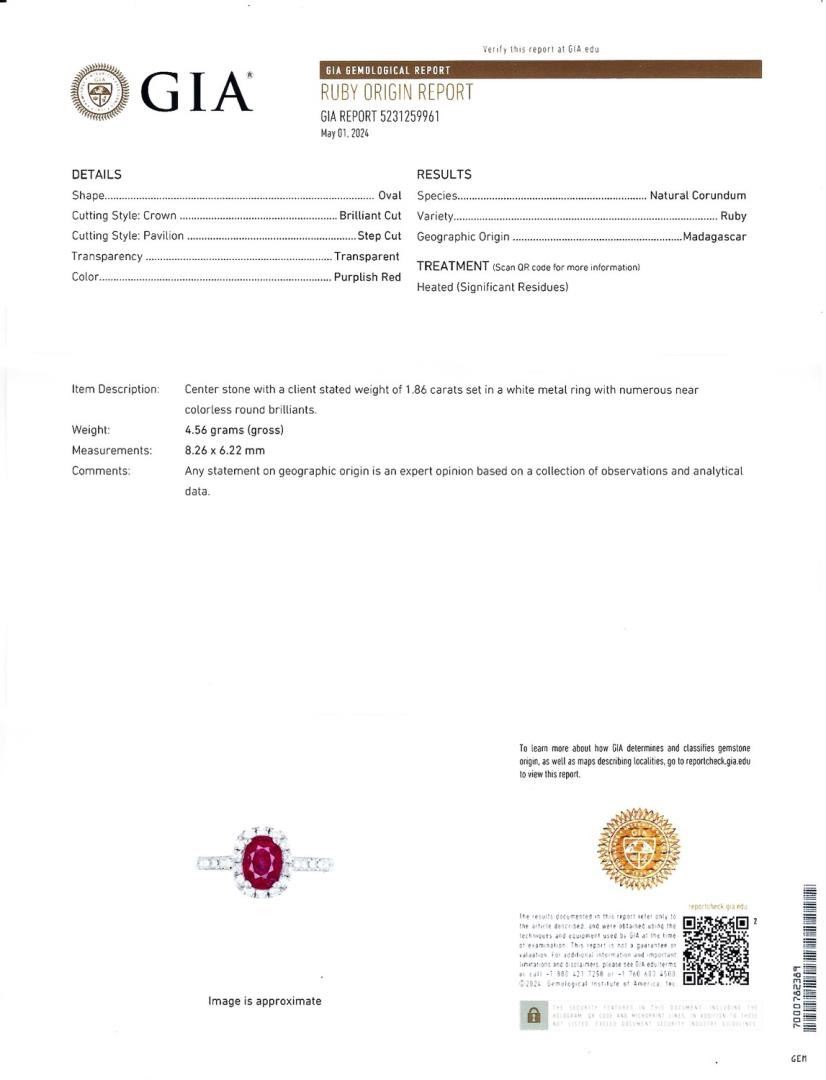 One polished. stamped. and tested 18K white gold ring with a bright finish. The ring is mounted with: 1 genuine GIA certified ruby center stone weighing approximately 1.86 carats. and 26 genuine round diamonds weighing approximately 0.70 carats. This item weighs 4.5 grams, condition is new, excellent workmanship. #MAIN GEMSTONE# GIA Report No.: 5231259961; Species: Natural Corundum; Variety: Ruby; Origin: Madagascar; Shape: Oval; Cutting Style: Brilliant Cut Crown, Step Cut Pavilion; Measurements: 8.26 x 6.22mm; Weight: 1.86 carats; Color: Purplish Red; Transparency: Transparent; Treatment: Heat with Residues; Refractive Index: 1.762 - 1.770 DR; Birefringence: 0.008 - 0.010; Hardness: 9 #ADJACENT GEMSTONES ON RING# Identity: Natural Diamond; Shape: Round; Cutting Style: Brilliant Cut; Quantity: 26 Diamonds; Measurements: 1.8 - 2.0mm; Total Weight: 0.70 carats; Clarity Grade: VS2-SI1; Color Grade: G-H; Refractive Index: 2.417; Hardness: 10; RUBY WEIGHT: 1.86 ct; TOTAL DIAMOND WEIGHT: 0.70 cts; WEIGHT OF ITEM: 4.5 grams; GOLD CONTENT: 18K White Gold #Size: 6 1/4