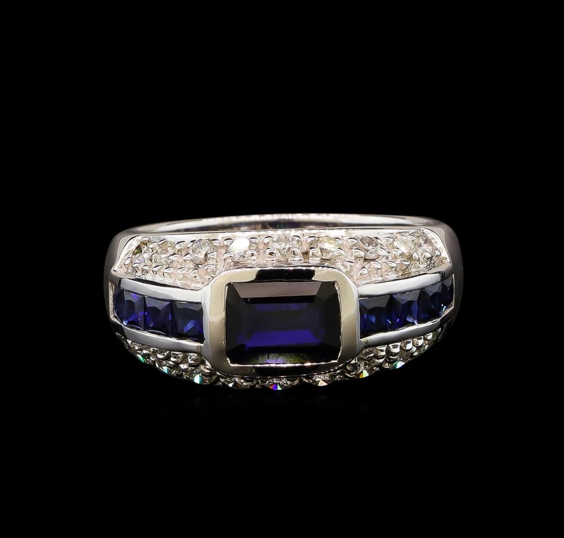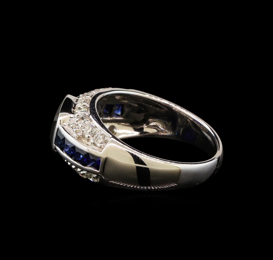 One electronically tested 14KT white gold lady's cast fashion ring with a wide band dome with a bright polish finish. The featured lady's ring has a shank measuring 3.00 millimeters wide. Identified with markings of '14K'. Condition is new, good workmanship. Containing: One bezel set emerald standard step cut natural blue sapphire, measuring 7.00 x 5.10 x 2.90mm, (depth est.) 5%. bulge factor, approximate weight of 1.19ct., clarity is eye clean, dark, strong, blue color, (GIA B 7/5), cut is good. Transmitting light with no distortion, transparent. Colored gemstones are presumed to have been subjected to commonly used enhancement processes. Graded in the setting. Eight channel set princess modified brilliant cut natural blue sapphires, measuring 2.50 x 2.30 x 1.50mm, (depth est.) approximate total weight of 0.67ct., clarity is eye clean, medium dark, moderately strong, blue color, (GIA B 6/4), cut is very good. Transmitting light with no distortion, transparent. Colored gemstones are presumed to have been subjected to commonly used enhancement processes. Graded in the setting. Eighteen prong set round brilliant cut diamonds, measuring 1.95 - 1.85 x 1.16mm (depth est.) approximate total weight of 18 Stones = 0.46ct. Graded in the setting. Clarity SI-1 to SI-2. Color: G - I Cut Good. Total Weight of Colored Stones 1.86ct.. Total Weight of Diamonds 0.46ct.. Total Weight of Ring 5.80gm. GAS Appraised at $3,860.00.