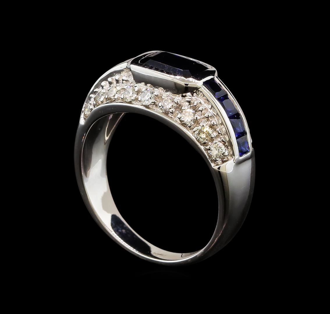 One electronically tested 14KT white gold lady's cast fashion ring with a wide band dome with a bright polish finish. The featured lady's ring has a shank measuring 3.00 millimeters wide. Identified with markings of '14K'. Condition is new, good workmanship. Containing: One bezel set emerald standard step cut natural blue sapphire, measuring 7.00 x 5.10 x 2.90mm, (depth est.) 5%. bulge factor, approximate weight of 1.19ct., clarity is eye clean, dark, strong, blue color, (GIA B 7/5), cut is good. Transmitting light with no distortion, transparent. Colored gemstones are presumed to have been subjected to commonly used enhancement processes. Graded in the setting. Eight channel set princess modified brilliant cut natural blue sapphires, measuring 2.50 x 2.30 x 1.50mm, (depth est.) approximate total weight of 0.67ct., clarity is eye clean, medium dark, moderately strong, blue color, (GIA B 6/4), cut is very good. Transmitting light with no distortion, transparent. Colored gemstones are presumed to have been subjected to commonly used enhancement processes. Graded in the setting. Eighteen prong set round brilliant cut diamonds, measuring 1.95 - 1.85 x 1.16mm (depth est.) approximate total weight of 18 Stones = 0.46ct. Graded in the setting. Clarity SI-1 to SI-2. Color: G - I Cut Good. Total Weight of Colored Stones 1.86ct.. Total Weight of Diamonds 0.46ct.. Total Weight of Ring 5.80gm. GAS Appraised at $3,860.00.