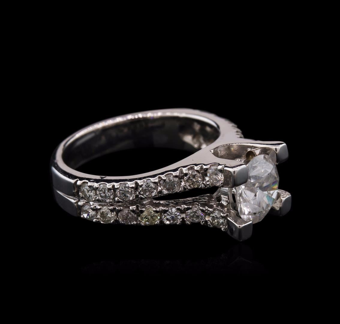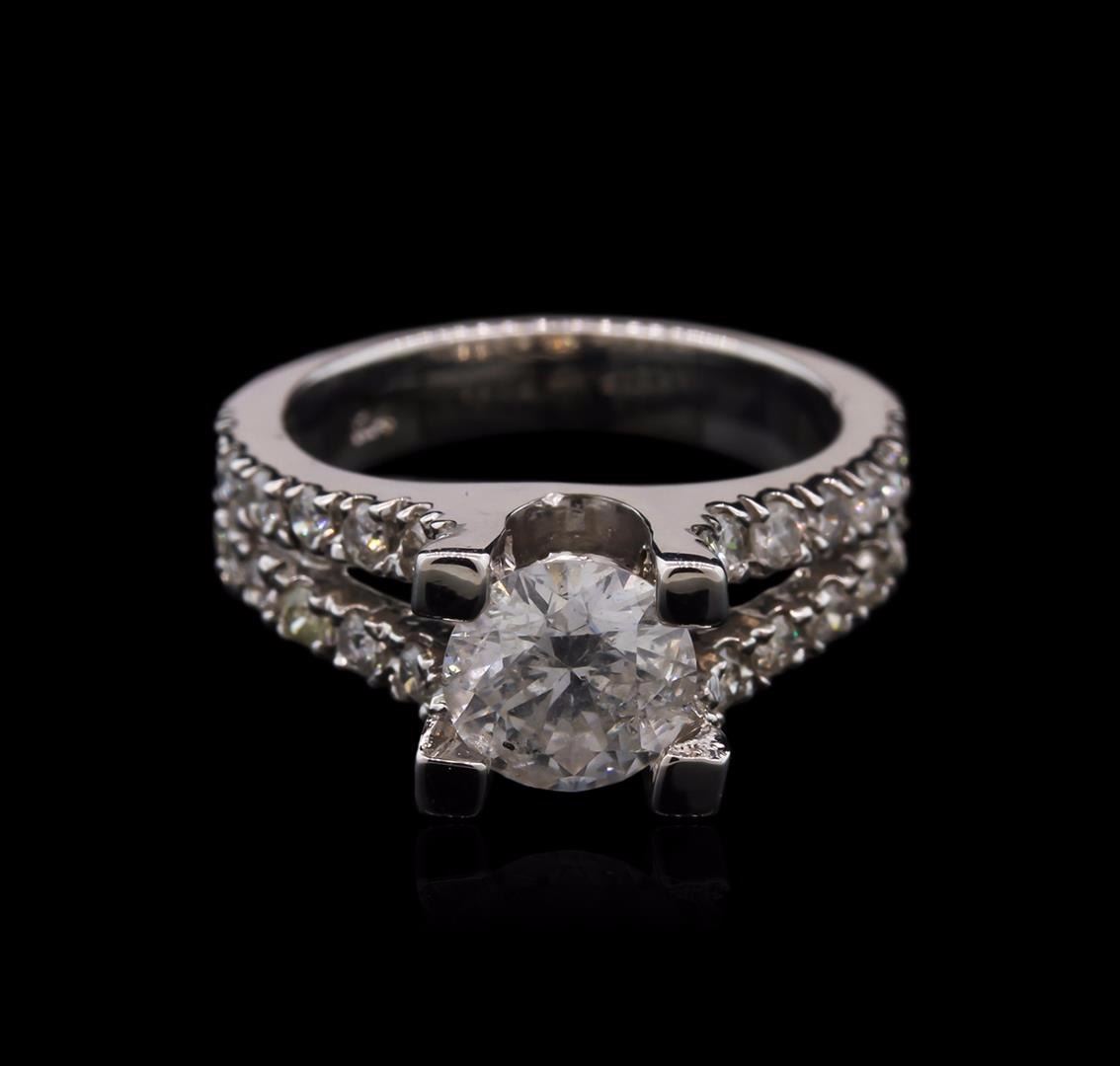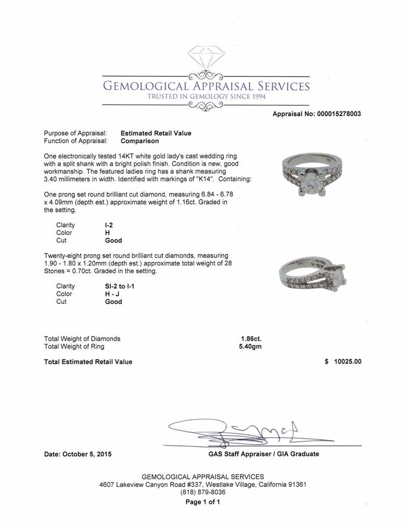 One electronically tested 14KT white gold lady's cast wedding ring with a split shank with a bright polish finish. The featured ladies ring has a shank measuring 3.40 millimeters in width. Identified with markings of "K14". Condition is new, good workmans GAS Appraised at $10,025.00.